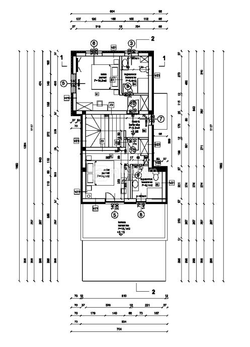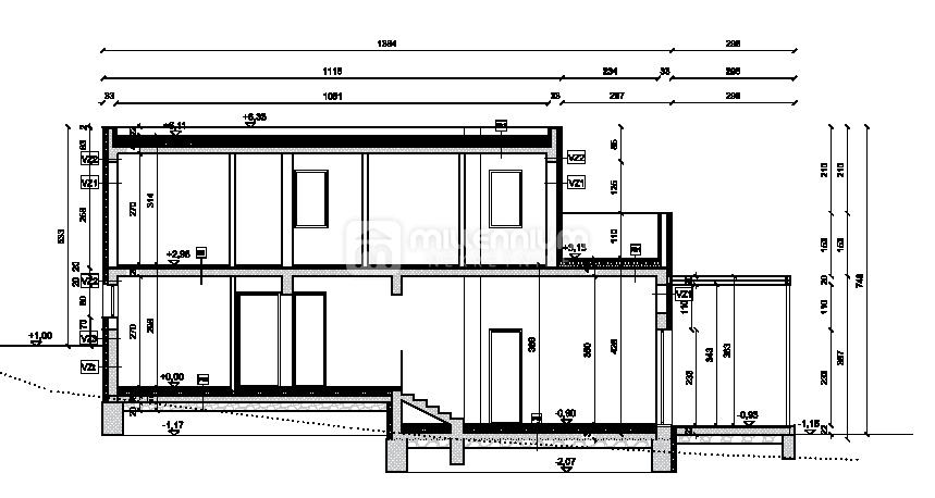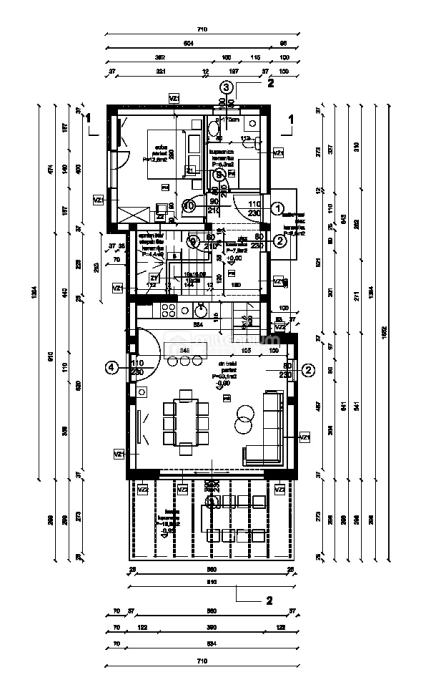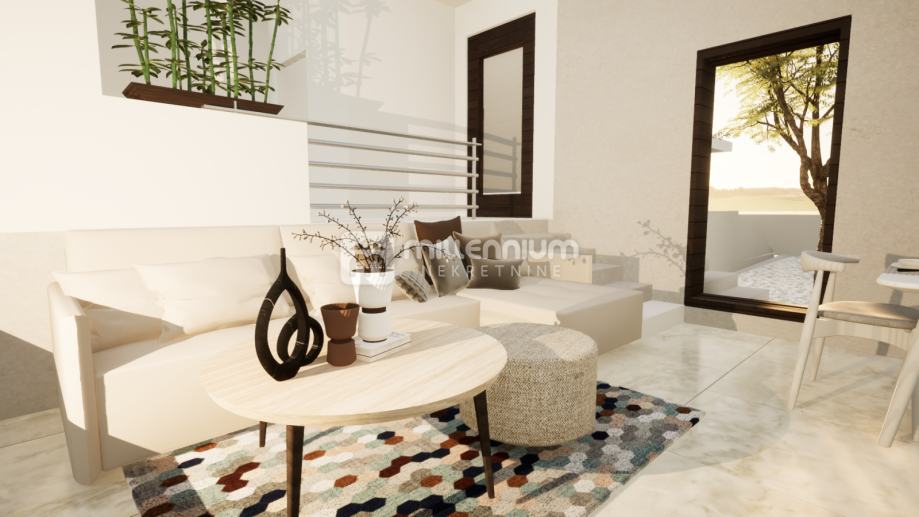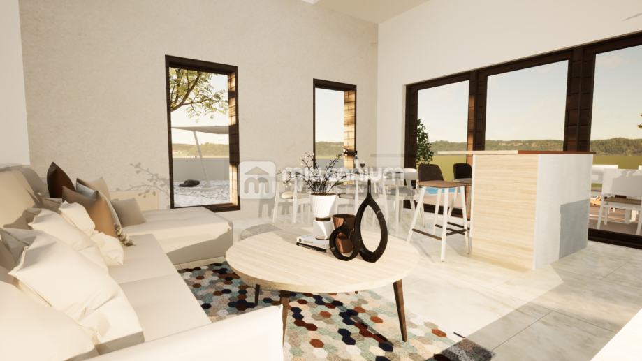 U prizemlju se nalaze ulaz, dnevni boravak, blagovaonica, kuhinja, natkrivena terasa, soba, kupaonica, spremište i stepenište koje vodi na 1. kat gdje su smještene dvije spavaće sobe s kupaonicama i hodnik.