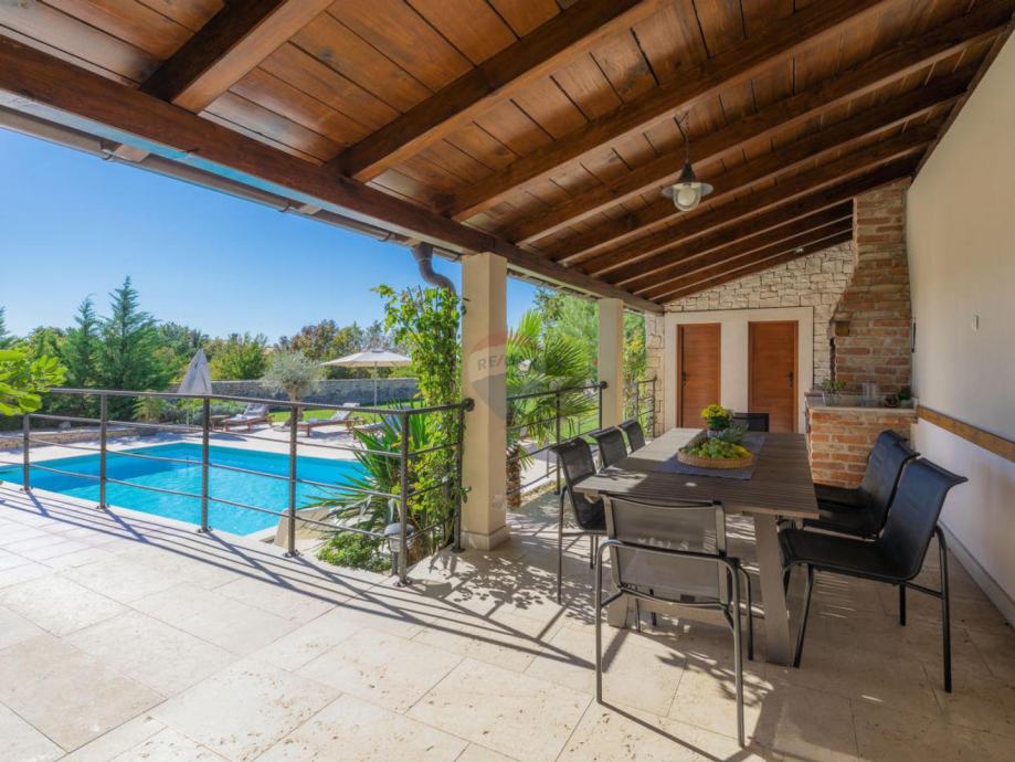 Iz dnevnog boravka izlazi se na prostranu natkrivenu terasu s ljetnom kuhinjom, zidanim roštiljem i vanjskom blagovaonicom, koja pruža pogled na bazen i zelenilo.