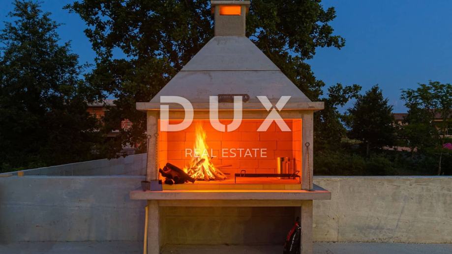 Okućnica površine oko 800 m2 sadrži prekrasan bazen za uživanje u toplim ljetnim danima. Dostupna je i natkrivena terasa s vanjskim prostorom za objedovanje te vanjski kamin.