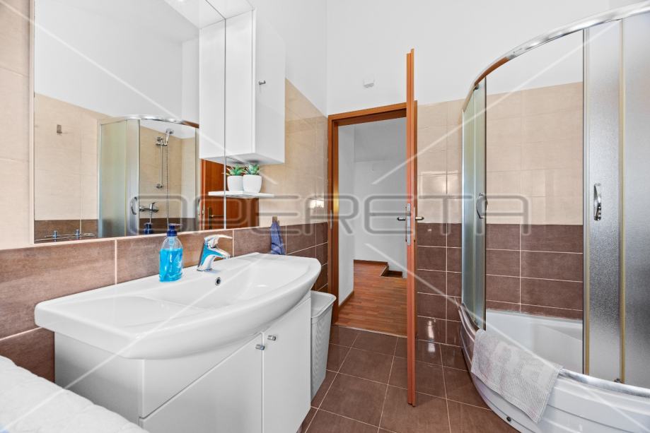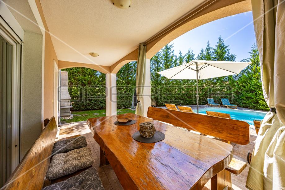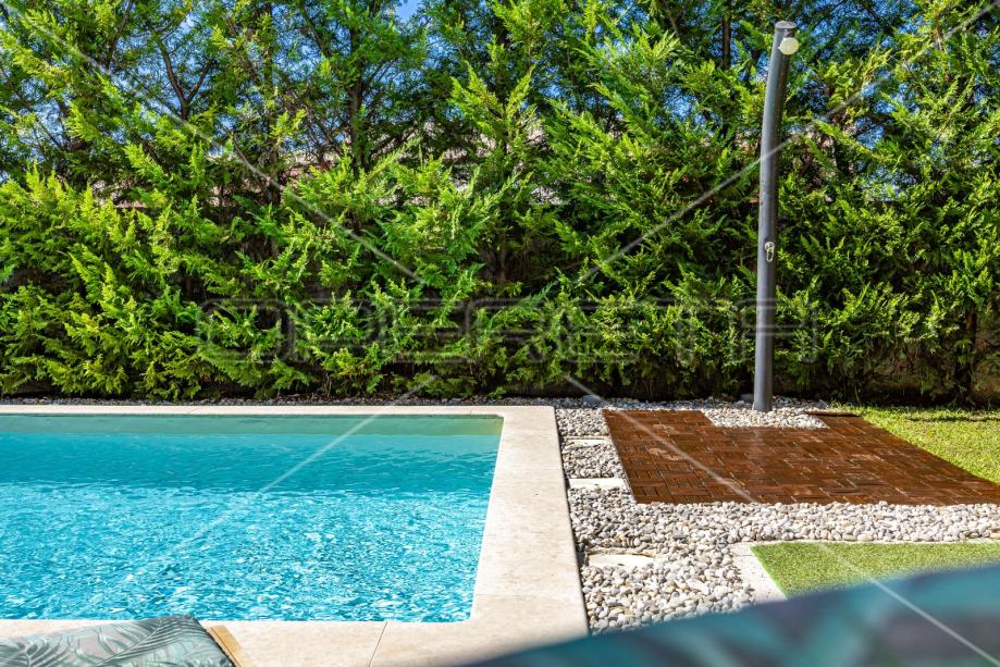 U ograđenom i uređenom vrtu površine 145 m2 smjestio se bazen, sunčalište, vanjski tuš i roštilj.