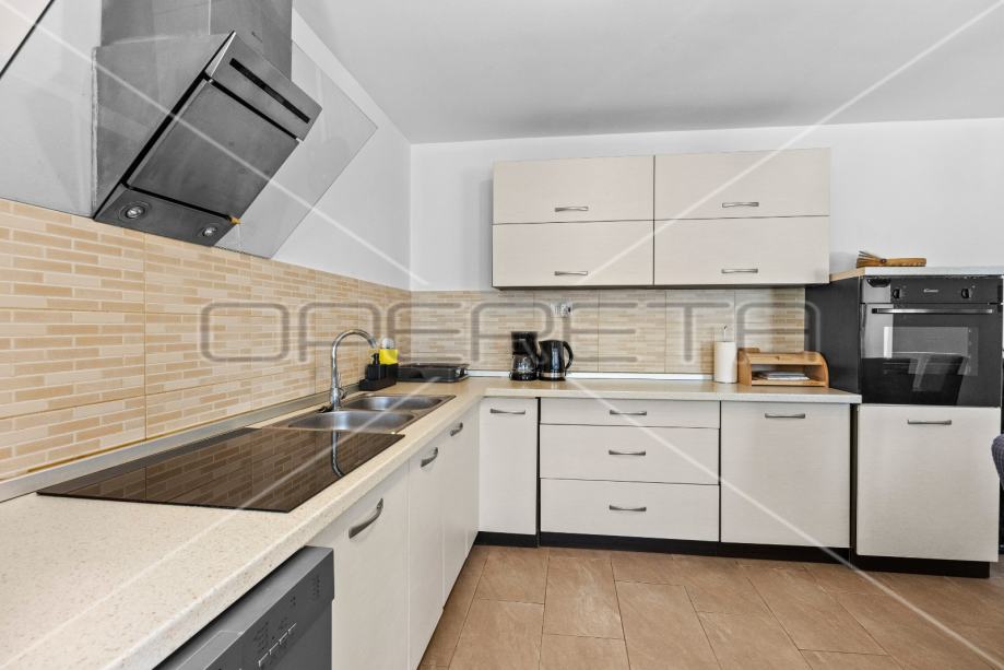 U prizemlju je hodnik, dnevni boravak s izlazom na natkrivenu terasu, kuhinja s blagovaonicom, ostava i toalet.