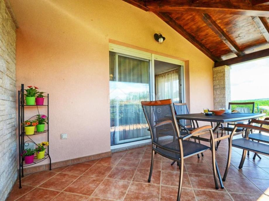 U nastavku su velike staklene stijene koje omogućuju izlaz na natkrivenu terasu.