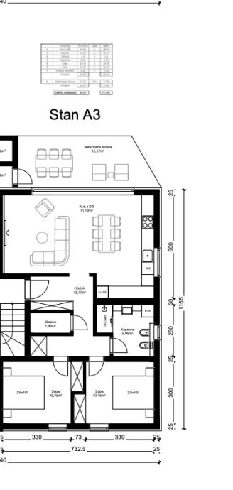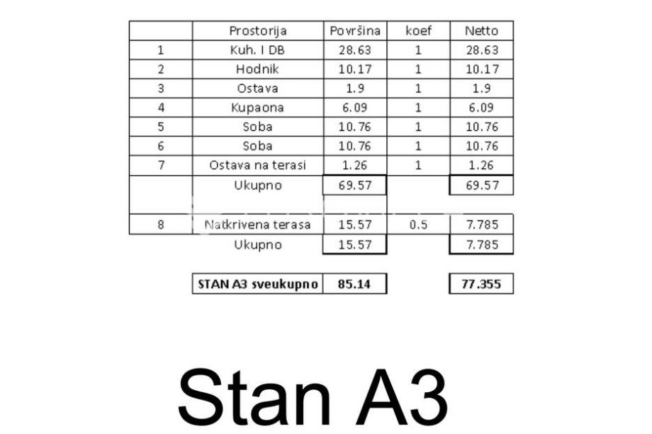 Novogradnja dvosobnog stana s velikom natkrivenom terasom i vrtom. U prekrasnom gradu Taru počinje izgradnja moderne zgrade s 8 stambenih jedinica. Zgrada "A" ima 4 stana, dva u prizemlju i dva na prvom katu. Stan "A3" nalazi se na prvom katu NKP 77.35m2. Sastoji se od ulaznog hodnika, ostava,...