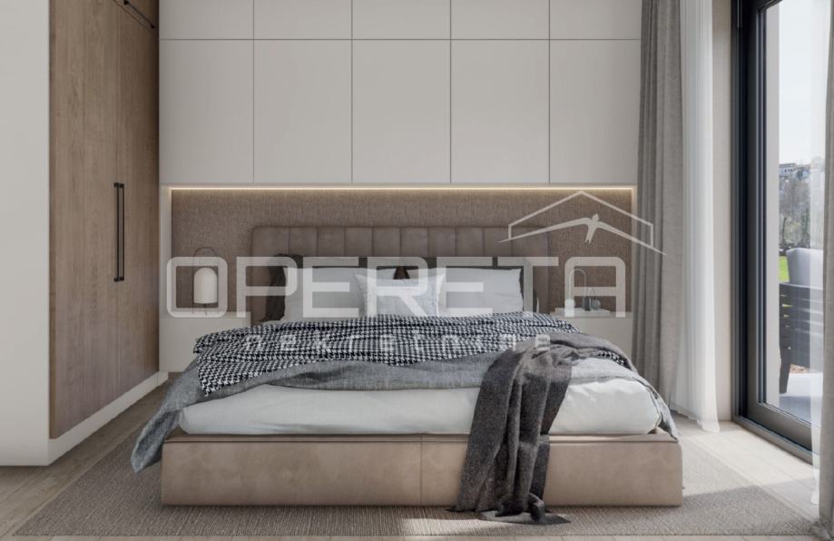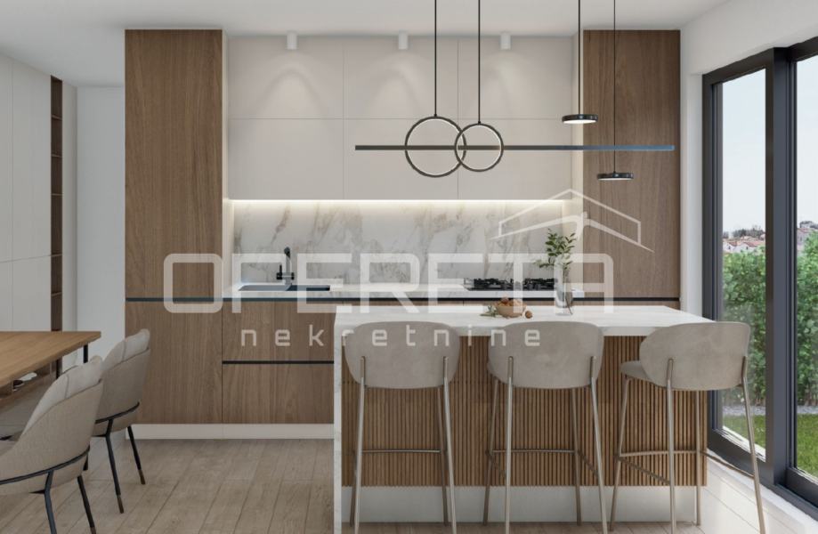 Stan se nalazi na drugom katu stambene zgrade te obuhvaća ulazni hodnik, open space prostor s kuhinjom, blagovaonicom i dnevnim boravkom koji ima izlaz na loggiu. U stanu se nalaze dvije spavaće sobe, od kojih jedna ima vlastiti izlaz na balkon, moderna kupaonica te dva parkirna mjesta koja su uključena u cijenu.