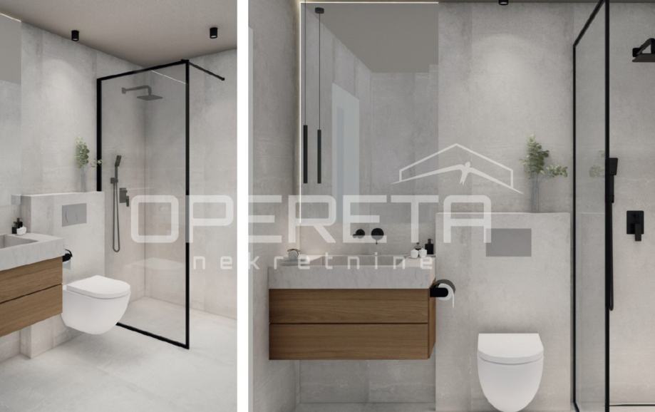 Oprema stana uključuje podno grijanje u cijelom prostoru, klima uređaj, keramiku vrhunske talijanske kvalitete te sanitarije marke Villeroy & Boch.