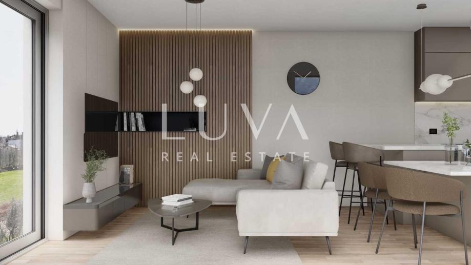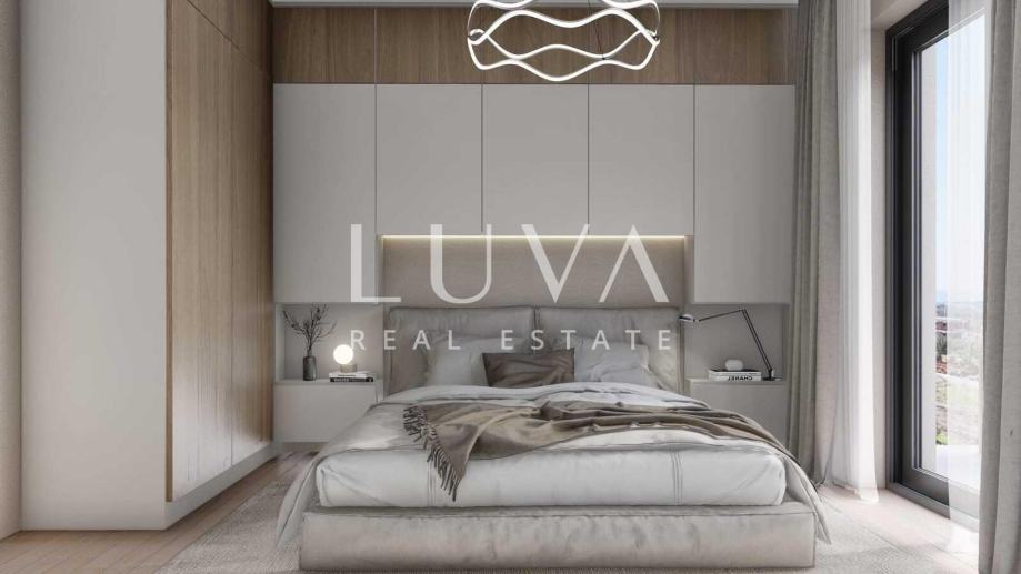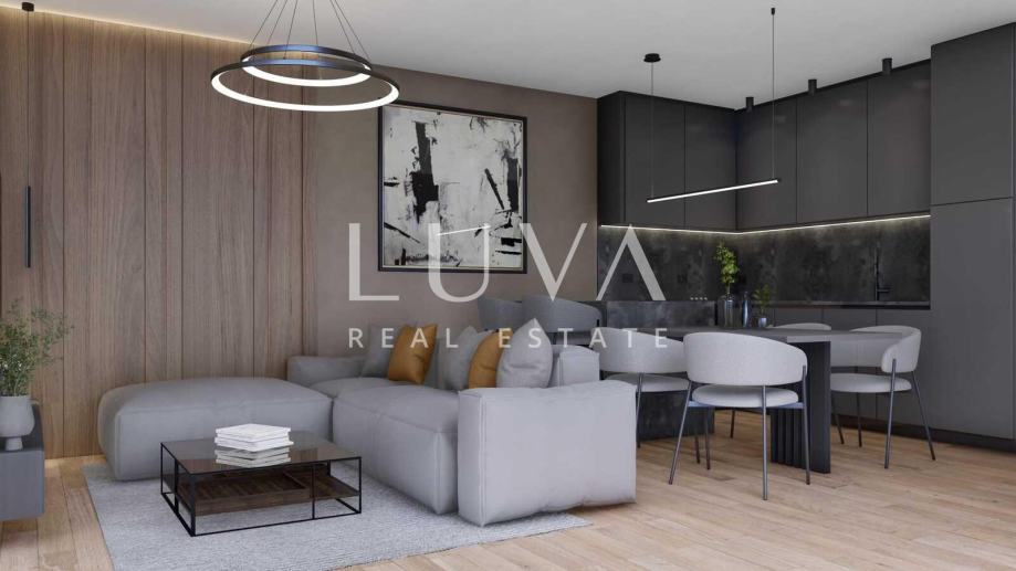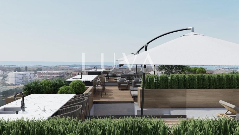 Stan se sastoji od ulaznog hodnika, prostrane open-space kuhinje s blagovaonicom i dnevnim boravkom iz kojeg se izlazi na terasu, savršenu za jutarnju kavu ili večernje opuštanje. Ima dvije spavaće sobe od kojih jedna ima izlaz na balkon te moderno uređenu kupaonicu.Stan ima vlastitu krovnu terasu sa pripremom za jacuzzi, saunu, ljetnu kuhinju i 2 parkirna mjesta koja su uključena u cijenu.