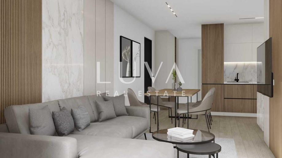 Stan se sastoji od ulaznog hodnika, prostrane open-space kuhinje s blagovaonicom i dnevnim boravkom iz kojeg se izlazi na ugodnu lođu, savršenu za jutarnju kavu ili večernje opuštanje. Ima dvije spavaće sobe, od kojih jedna ima vlastiti balkon, te moderno uređenu kupaonicu. Uz stan dolaze i dva privatna parkirna mjesta koja su uključena u cijenu.