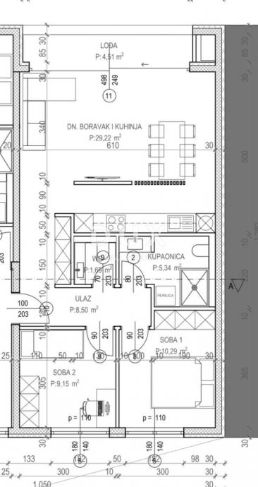 Stan površine 67,57 m² koncipiran je funkcionalno i suvremeno te se sastoji od ulaznog prostora, open-space dnevnog boravka s kuhinjom i blagovaonicom, dvije spavaće sobe, kupaonice, dodatnog WC-a te lođe.