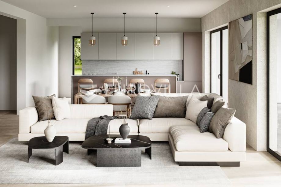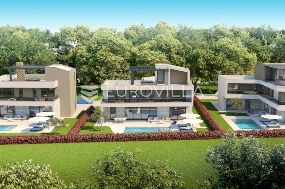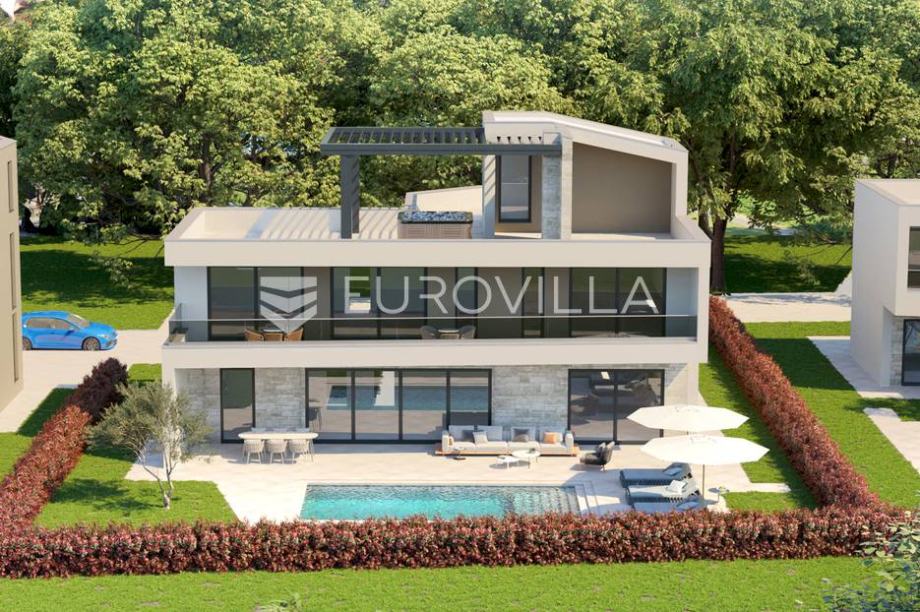 Istria, Tar-Vabriga, under construction, an elegant modern villa in the immediate vicinity of Poreč.This modern villa spans across 3 floors. The ground floor comprises a living room, kitchen, and dining area of impressive size, measuring 55m2. Additionally, on the ground floor, there is a wellness...