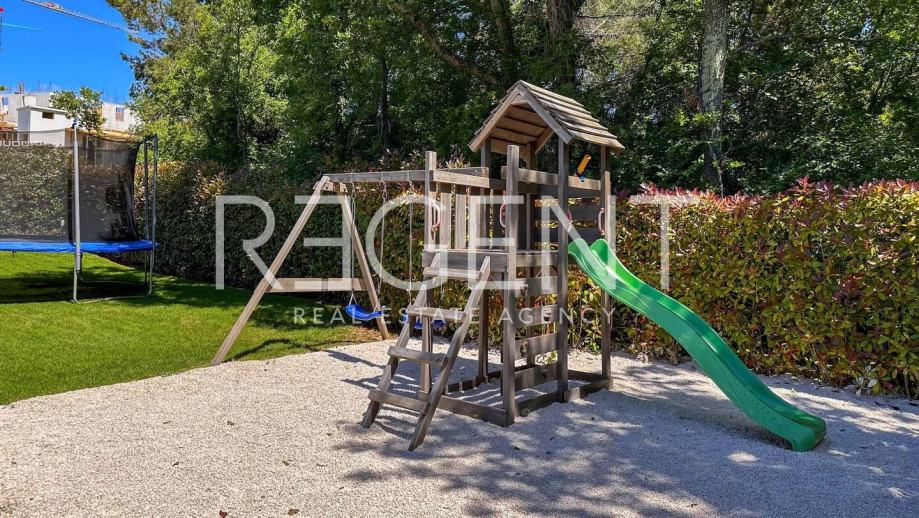 U mirnom dijelu priobalnog mjesta smještena je prostrana vila s privatnim bazenom, jacuzzijem i velikim vrtom – savršena za odmor s obitelji ili kao investicija za turistički najam.Ukupna površina parcele iznosi 1201 m², a sama vila je moderno uređena i potpuno opremljena. Vila može ugostiti do 10 osoba, a u dvorištu su osigurana 4 parkirna mjesta.Vila se sastoji od:Četiri spavaće sobe, svaka s vlastitom kupaonicomDnevnog boravka s kaminomPotpuno opremljene kuhinje s blagovaonicomUkupno pet kupaonicaGostinjske sobeProstrane terase s izlazom na vrt i bazenU sklopu okućnice nalaze se:Bazen površine 51 m²Vanjski jacuzziSunčalište s ležaljkamaDječje igrališteUređeni vrtFitness kutakZa više informacija i dogovor oko razgledavanja, slobodno nas kontaktirajte!Za više informacija, kontaktirajte našeg agenta na brojeve telefona: