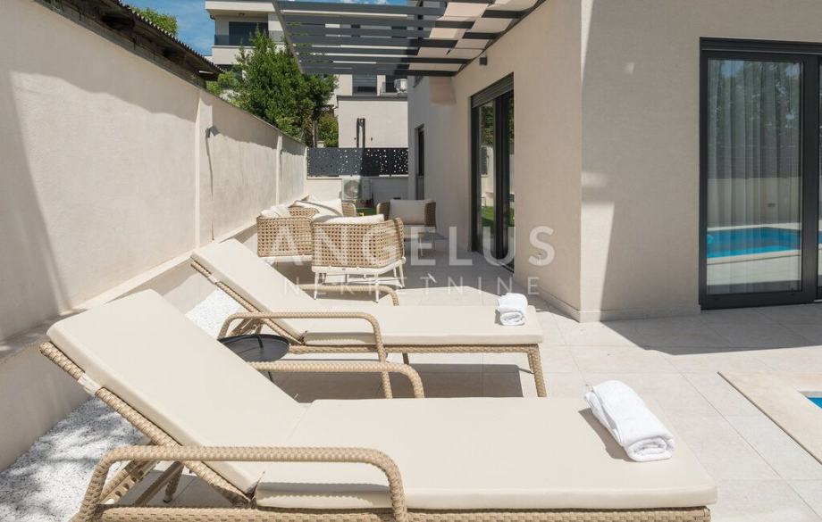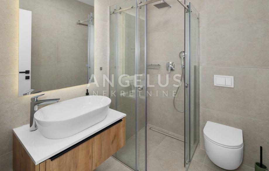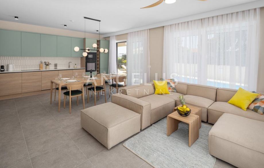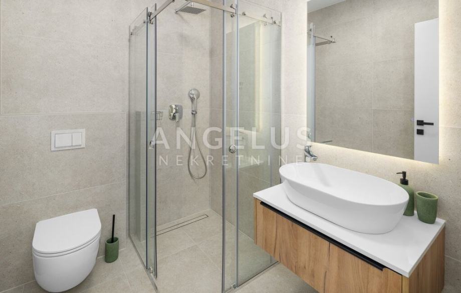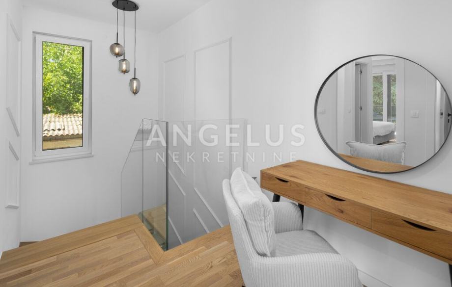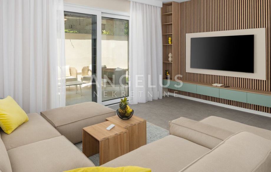 OPIS: Stan je kompletno namješten i dizajniran prateći trenutni trend ambiente, ovaj stan je idealan za življenje i relaxiranje. Ugodan, komforna i udoban sva tri svojstav daju ovoj smještajnoj jedinici, priliku da se osječaš kao kod kuće. Stan se daje u dugoročni najam na minimalno jednu godinu pa i više. Nalazi se u zgradi gdje ima još samo 3 tkava slična stana. Stan se sastoji u prizemlju od dnevnog boravka, kuhinje i blagovaonice, te jedne spavaće sobe sa kupaonom i gostinjskim toaletom. Na katu kuće nalaze se još dvije spavće sobe sa kupaonama i velikom terasom sa pogledom na more.