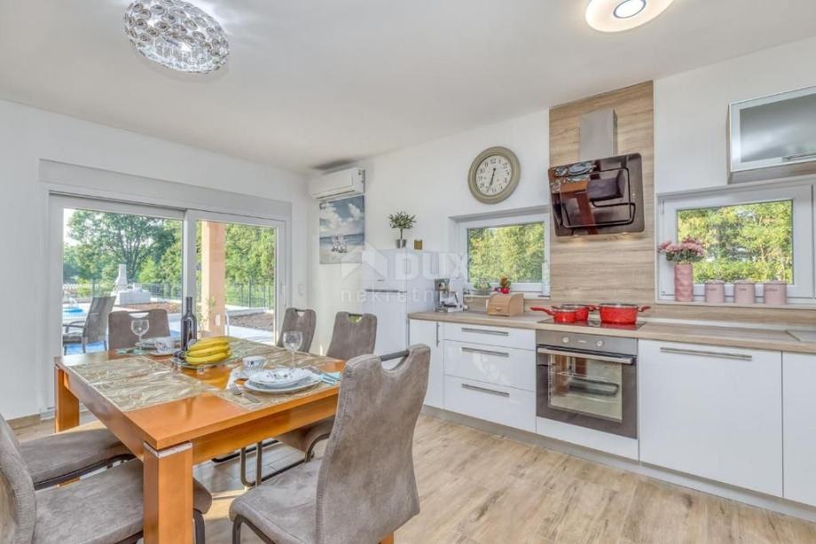 Tako se u prizemlju kuće na samome ulazu nalazi predvorje koje nas dalje vodi prema većem open space prostoru s komotnim dnevni boravkom, blagovaonom i moderno opremljenom kuhinjom. Ovaj prostor krase veće klizne staklene stijenke kroz koje se proteže pogled i pristup prema okućnici kuće i bazenu, te i većoj natkrivenoj terasi idealnoj za opuštanje s prijateljima i obitelji. U prizemlju kuće dodatno se nalaze izdvojeno gostinjsko kupatilo i ostava.