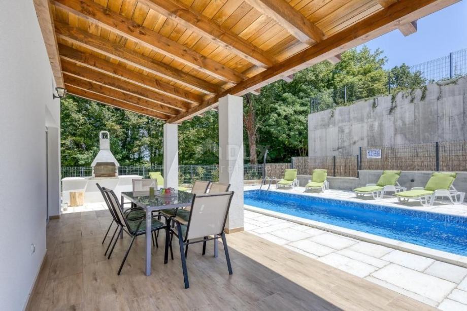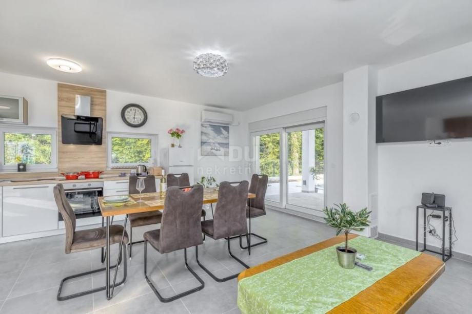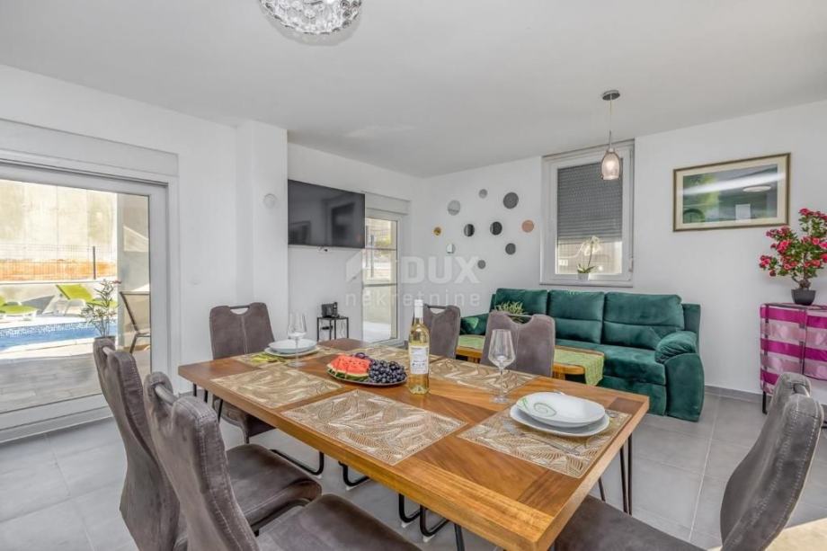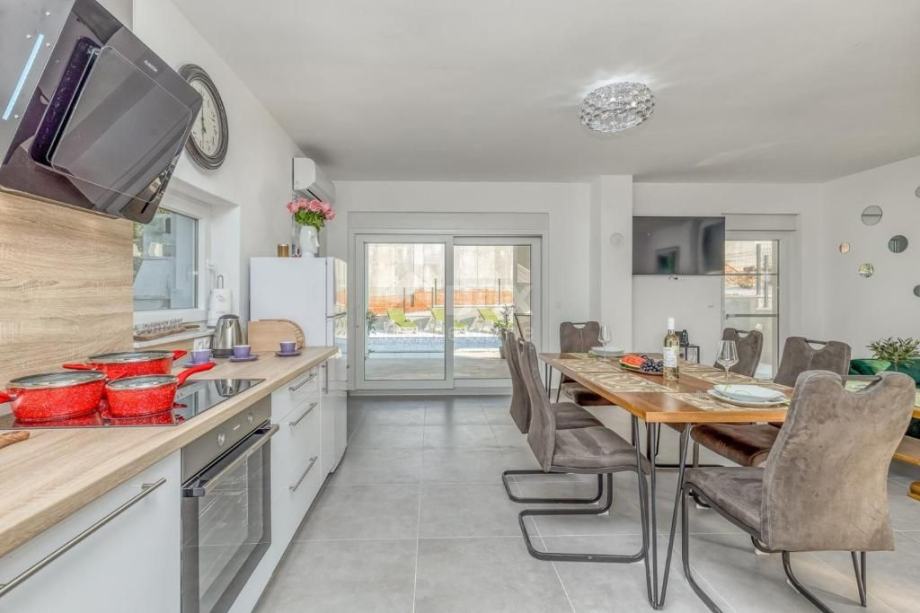 Tako se u prizemlju kuće na samome ulazu nalazi predvorje koje nas dalje vodi prema većem open space prostoru s komotnim dnevni boravkom, blagovaonom i moderno opremljenom kuhinjom. Ovaj prostor krase veće klizne staklene stijenke kroz koje se proteže pogled i pristup prema okućnici kuće i bazenu, te i većoj natkrivenoj terasi idealnoj za opuštanje s prijateljima i obitelji. U prizemlju kuće dodatno se nalaze izdvojeno gostinjsko kupatilo i ostava.