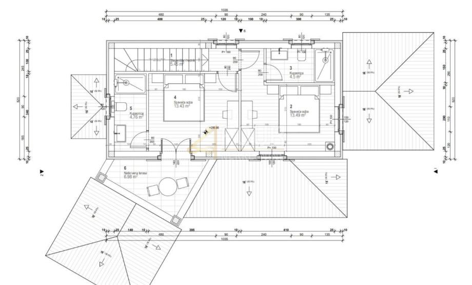 1. kat: hodnik, dvije spavaće sobe s vlastitim kupaonicama, natkrivena terasa.