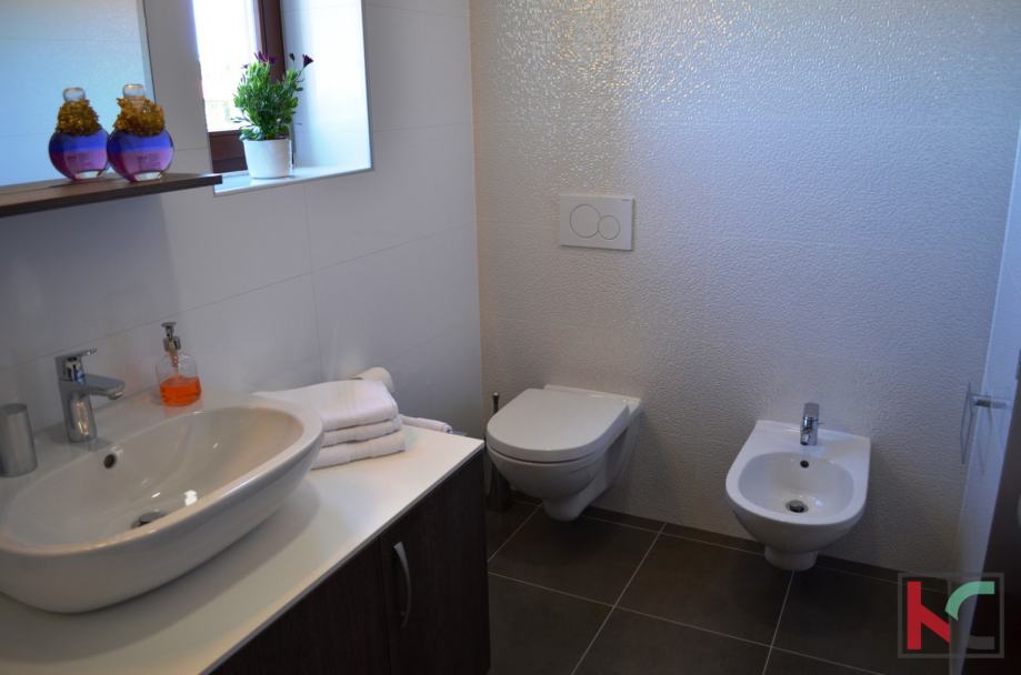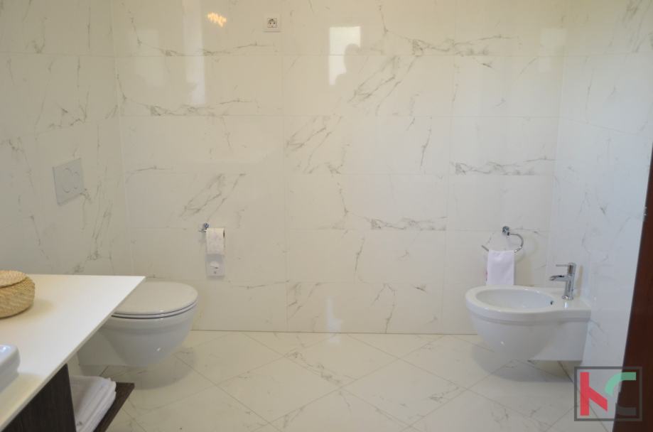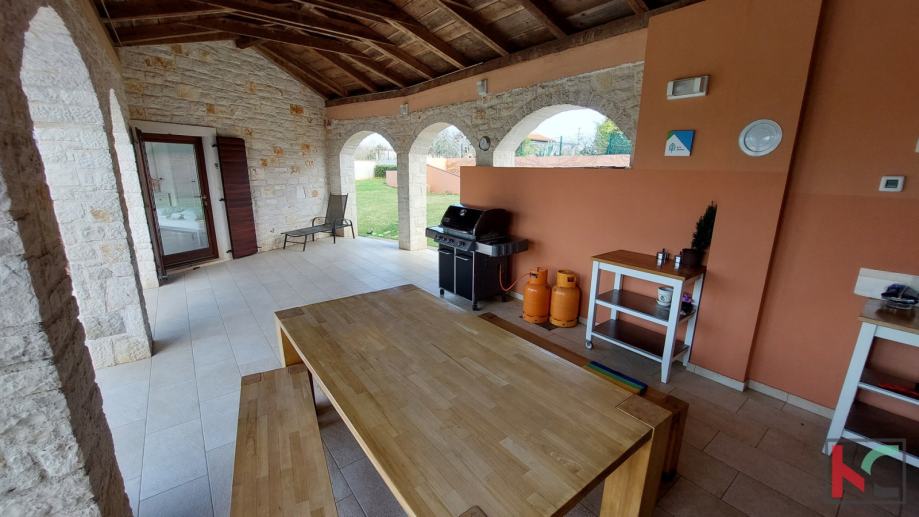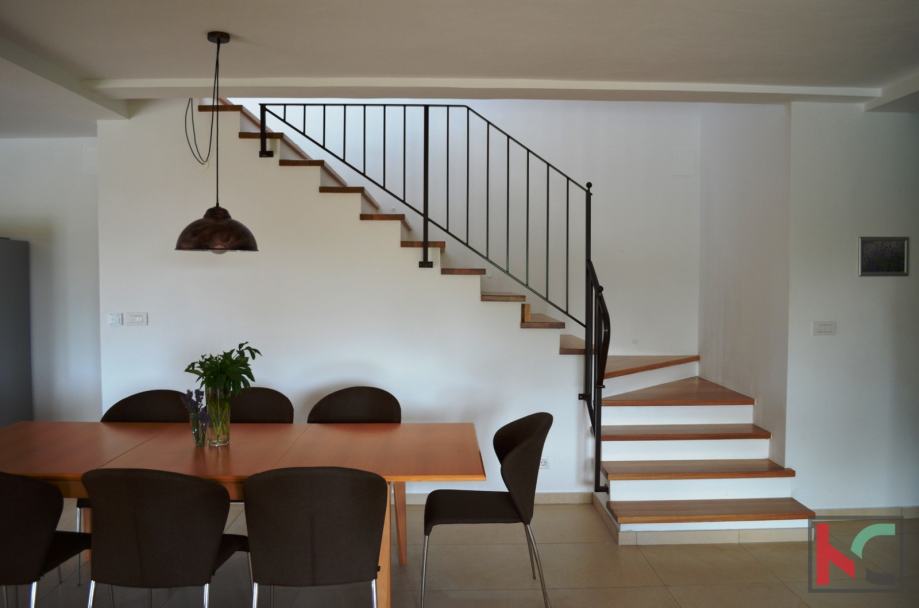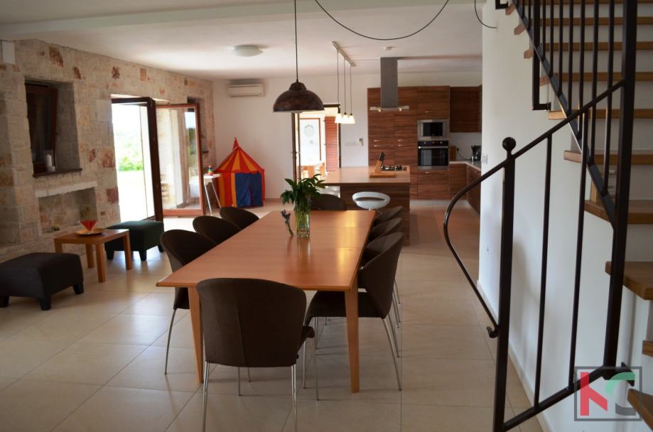 Kvalitetna talijanska keramika, drvene podne obloge od hrasta, drvena stolarija od ariša, kovana ograda, namještaj po mjeri te moderno opremljena kuhinja, podižu vrijednost ove nekretnine koja je vrlo očuvana i održavana.