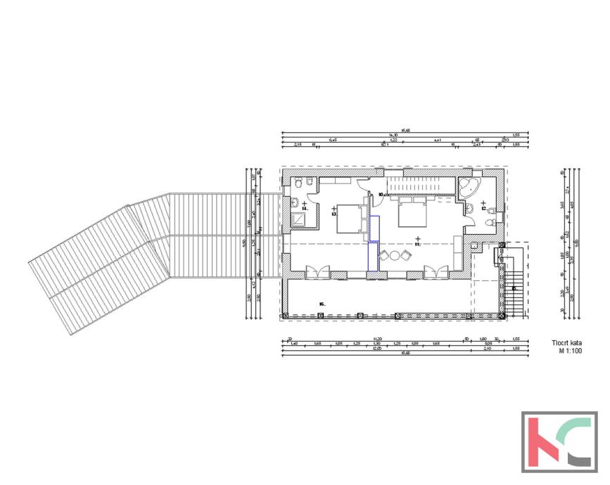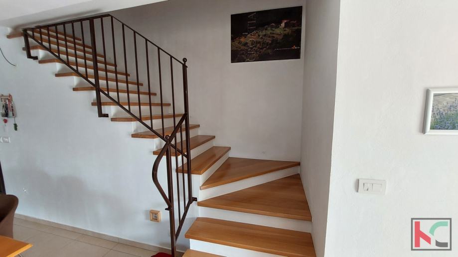Unutarnjim stepeništem dolazi se do prvog kata sa dvije spavaće sobe sa vlastitim kupaonicama te svaka sa svojim izlazom na natkrivenu terasu koja je povezana sa bazenom dodatnim vanjski stepeništem.