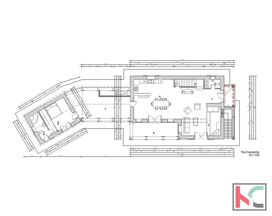 U prizemlju se nalazi, manji gostinjski WC, ostava, "open space" kuhinja sa dnevnim boravkom iz kojeg se izlazi na sunčalište sa bazenom, dok se iz "kuhinjskog dijela" izlazi na natkrivenu terasu sa ljetnom kuhinjom pored čega se smjestila i dodatni objekt sa spavaćom sobom i vlastitom kupaonicom.