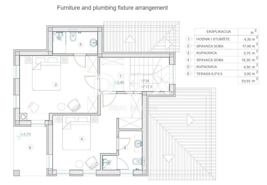 Ova elegantna vila površine 127,66 m², raspoređena na dvije etaže - prizemlje (73,73 m²) i kat (53,93 m²)—pruža savršenu ravnotežu između udobnosti i estetike.