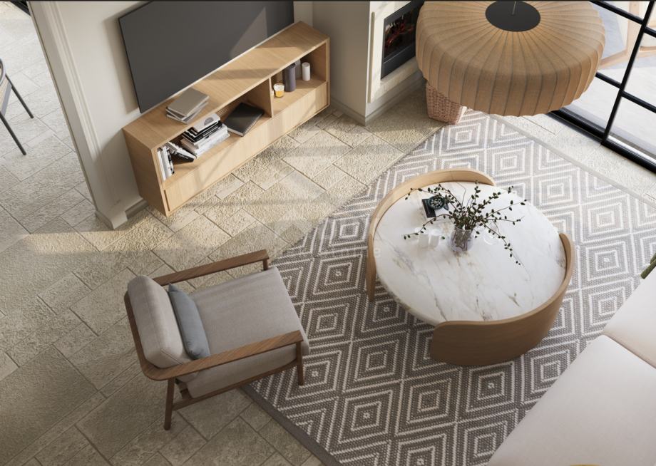 Tako se u prizemlju vile nalazi ulazno predvorje koje nas dočekuje i dalje vodi prema dnevnome prostoru koncipiranome kao otvoreni prostor bez pregradnih zidova. Ovdje je planirana postava većeg i komotnog dnevnoga boravka uz kamin na drva i klizna staklena stijenka kroz koju se proteže pristup i pogled prema okućnici i bazenu. Pored dnevnog boravka, blago izdvojenom se nalazi prostor za kuhinju s prostranom blagovaonom, iz koje se jednako tako kroz staklenu stijenku proteže izlaz prema natkrivenoj terasi.