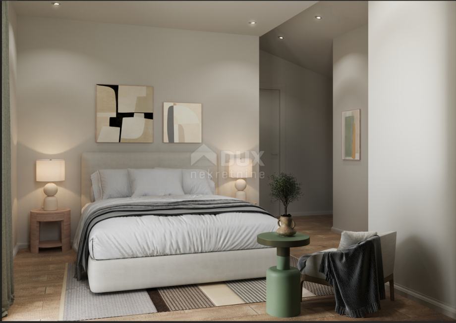 Uz dnevni boravak nalazi se i prva spavaća soba, izdvojena manjim hodnikom, a koja posjeduje vlastitu kupaonicu i pristup prema okućnicu.