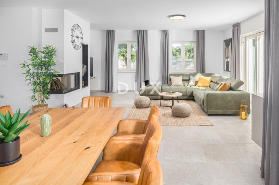 Kuća bezvremenskog dizajna djelomično obložena kamenom se oblikovno i koloristički uklopa u naselje i krajolik. Koncipirana je kao jedna stambena jedinica koja se proteže kroz dvije elegantno uređene i kvalitetno opremljene etaže.