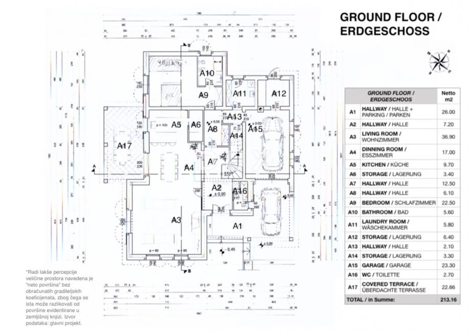 Prizemlje se sastoji od prostora otvorenog koncepta koji ujedinjuje kuhinju, blagovaonicu i dnevni boravak s izlazom na natkrivenu terasu, wellness prostora sa saunom, hidromasažnom kadom i kupaonicom, gostinjskog toaleta, praonice rublja, spremišta, ostave i garaže.
