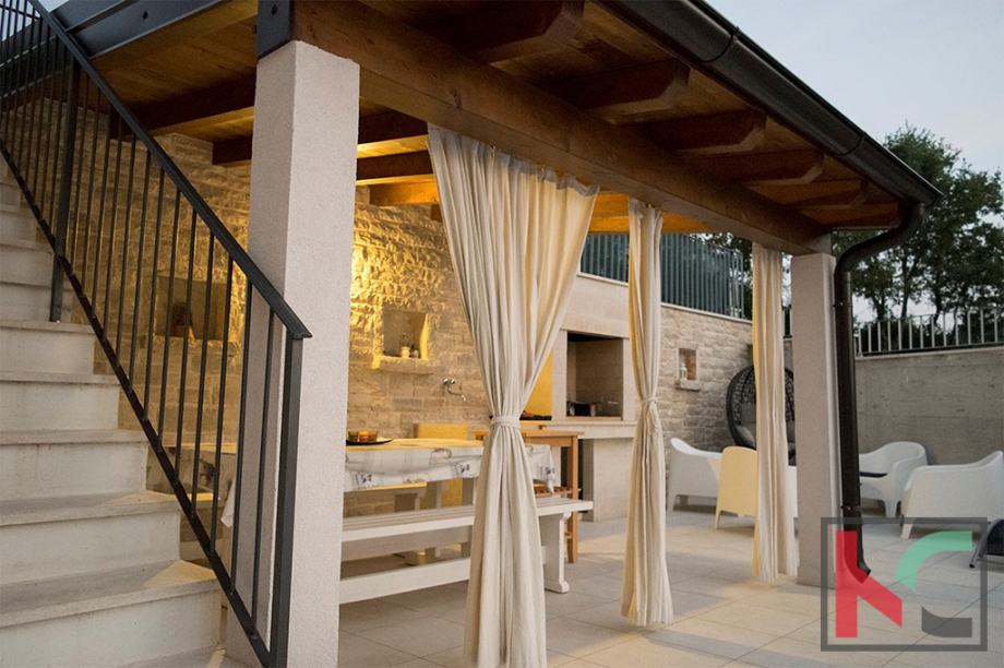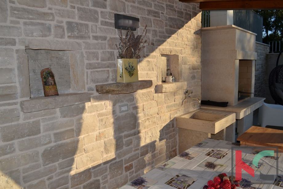 Vani se nalazi i bazen 8x3m sa popločanom terasom, natkrivenom blagovaonom i dijelom za kuhanje. Uz bazen imamo i tuš kao i suncobrane i ležaljke.