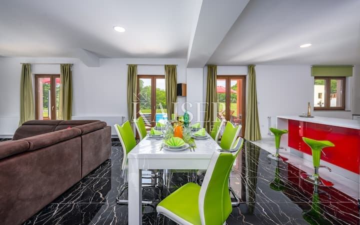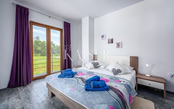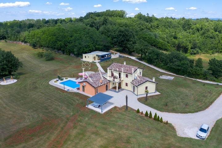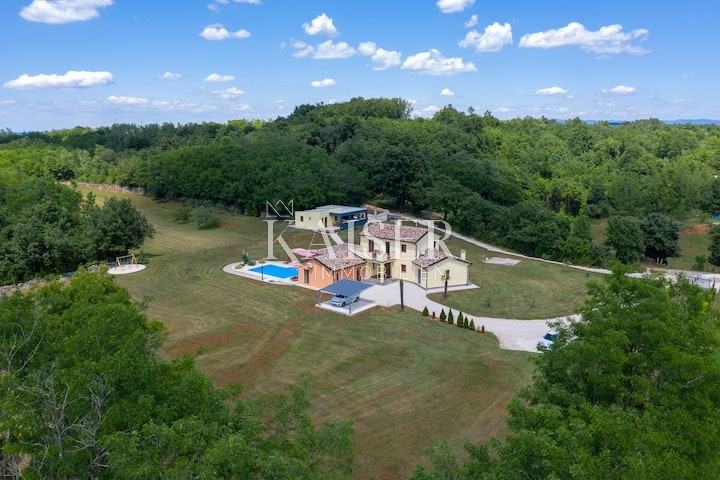 Velika okućnica od 12000m2 vam omogućuje da u ovoj vili možete uživati u ljepoti prirode, a opet istovremeno Vam nudi blizinu najljepših istarskih gradova. Svi gradski sadržaji nalaze se u 10-ak km udaljenom Pazinu, a smještaj u središnjoj Isti omogućuje dobru prometnu povezanost s ostatkom poluotoka.