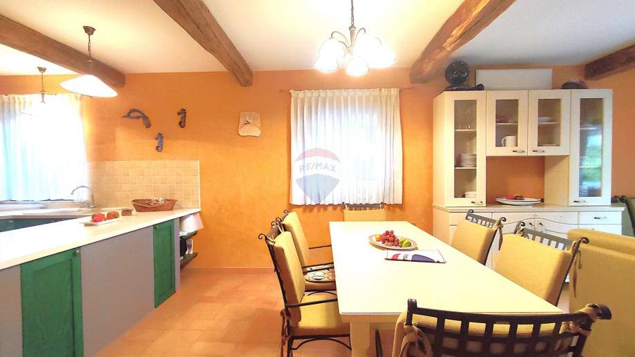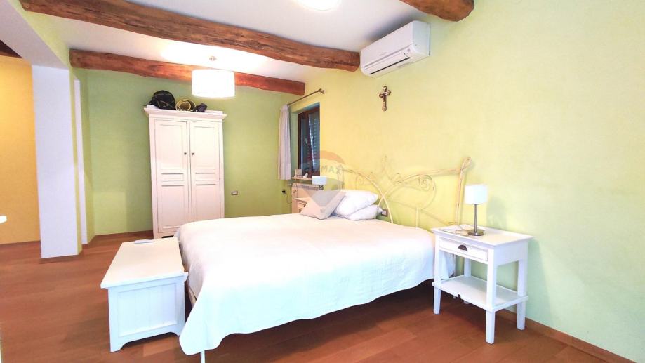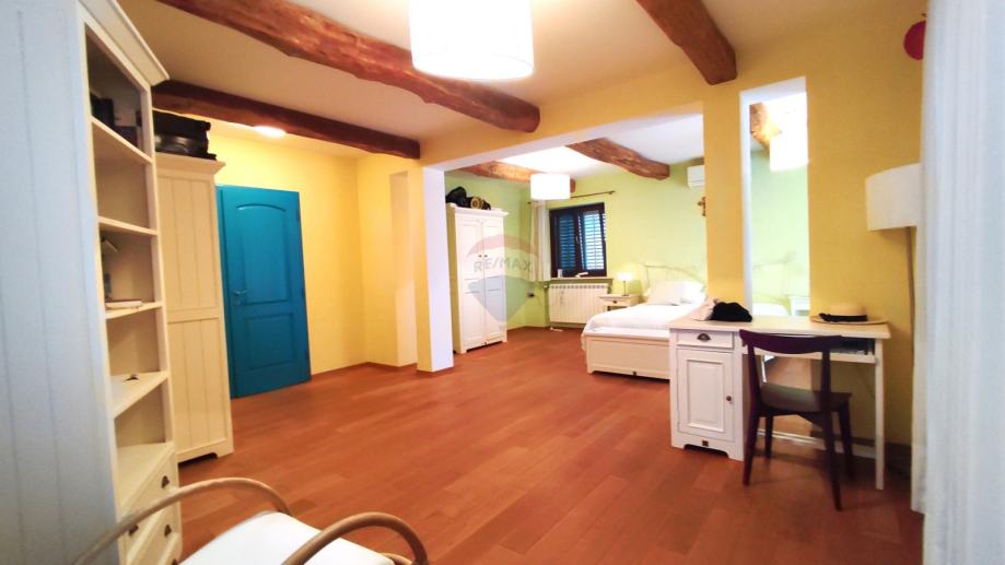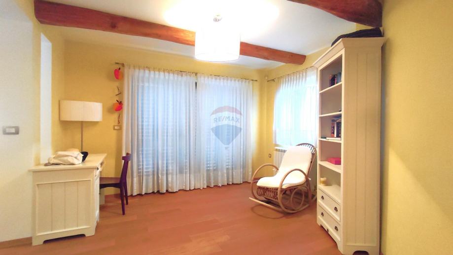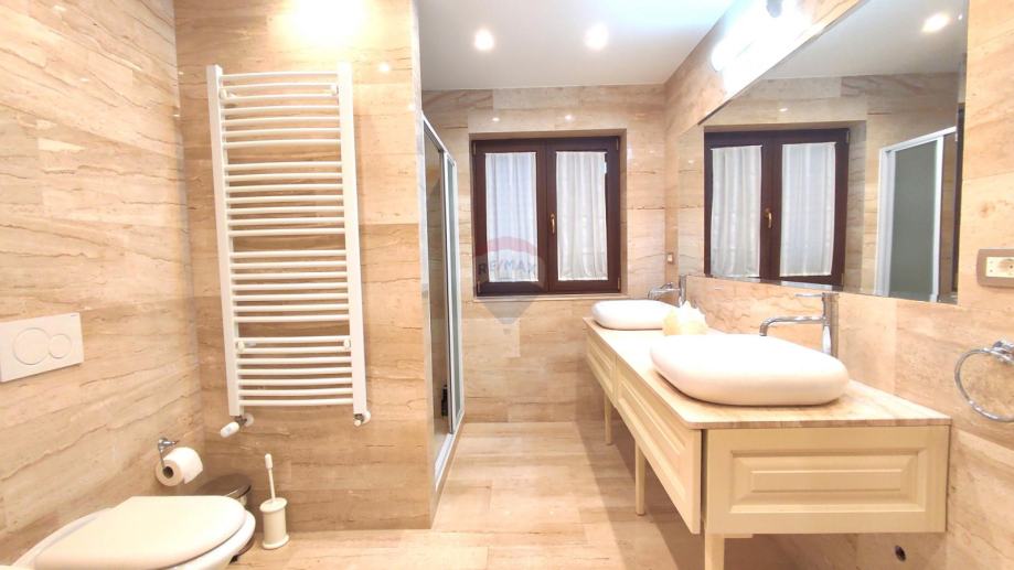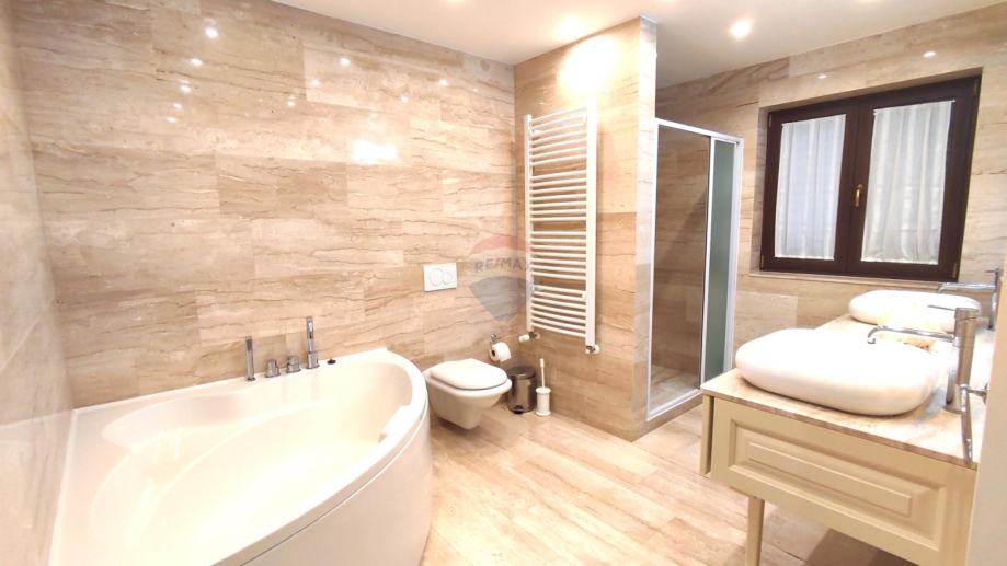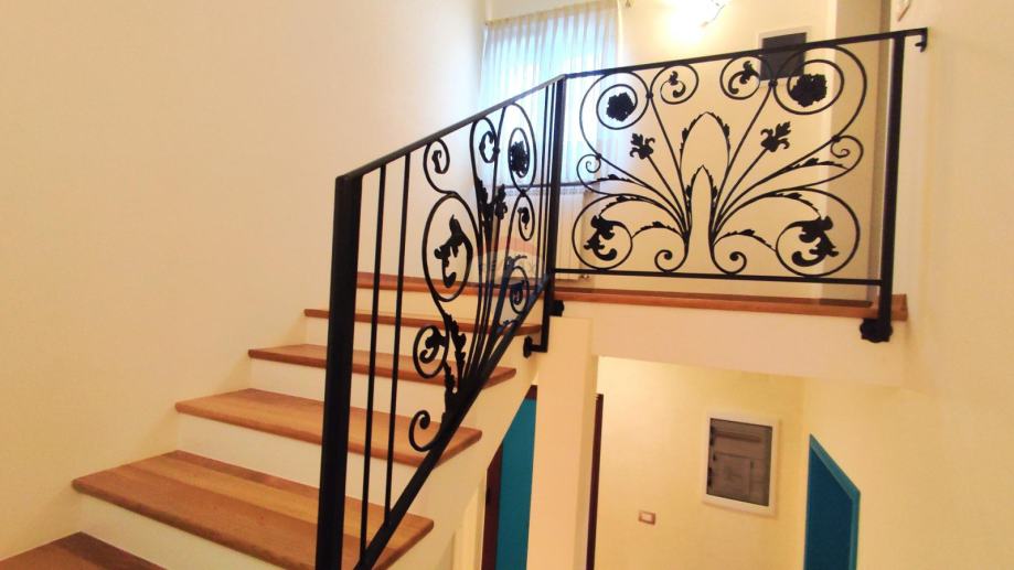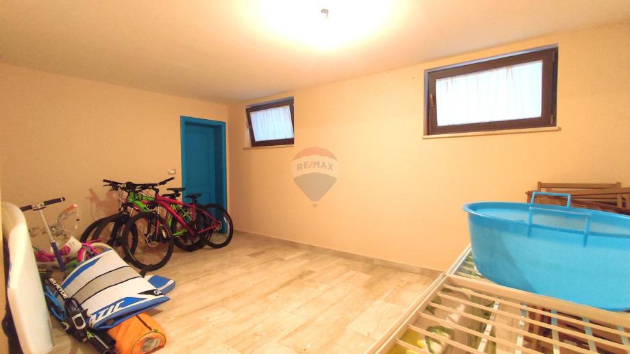 U suterenu kuće se nalaze 2 spavaće sobe, kupaonica, spremište, praonica i kotlovnica. Prizemlje karakterizira veliki dnevni prostor otvorenog koncepta s kuhinjom, blagovaonicom i dnevnim boravkom s kaminom, uz 2 spavaće sobe, kupaonicom, te izlazom na terasu i vrt. Iz hodnika u prizemlju se pristupa svim etažama, pa tako i katu na kojem su još 2 spavaće sobe, svaka sa svojom kupaonicom i terasom.