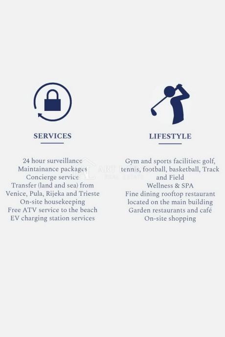 Resort je zatvorenog tipa te pruža usluge nadzora i održavanja. Mogućnost upotrebe svih raspoloživih bogatih sadržaja unutar samog resorta: restorana, dućana, barova, golf terena, teretana, Wellness-SPA, infinity krovnog bazena s jedinstvenim panoramskim pogledom na more i Savudrijsku valu. Plaže su nadomak cijelog kompleksa na 100 m od samog resorta.
