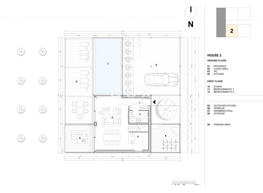 Vila ima ukupnu površinu od 472 kvadrata, od čega je 202 kvadrata pod krovom. Unutarnji stambeni dio iznosi 105 kvadrata, a dodatni prostori uključuju 65 kvadrata natkrivenih terasa, 16 kvadrata natkrivenog balkona te 16 kvadrata spremišta za bicikle. Vanjski prostor čini privatni vrt površine 206 kvadrata, ulazni vrt od 16 kvadrata, privatni bazen površine 22 kvadrata te dva parkirna mjesta ukupne površine 26 kvadrata.