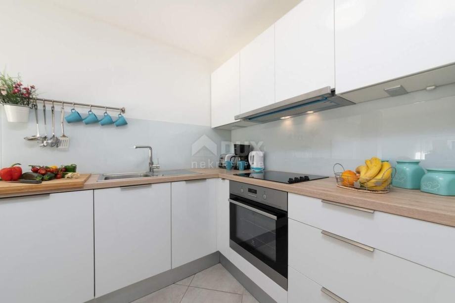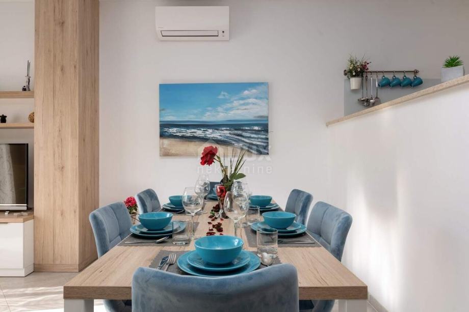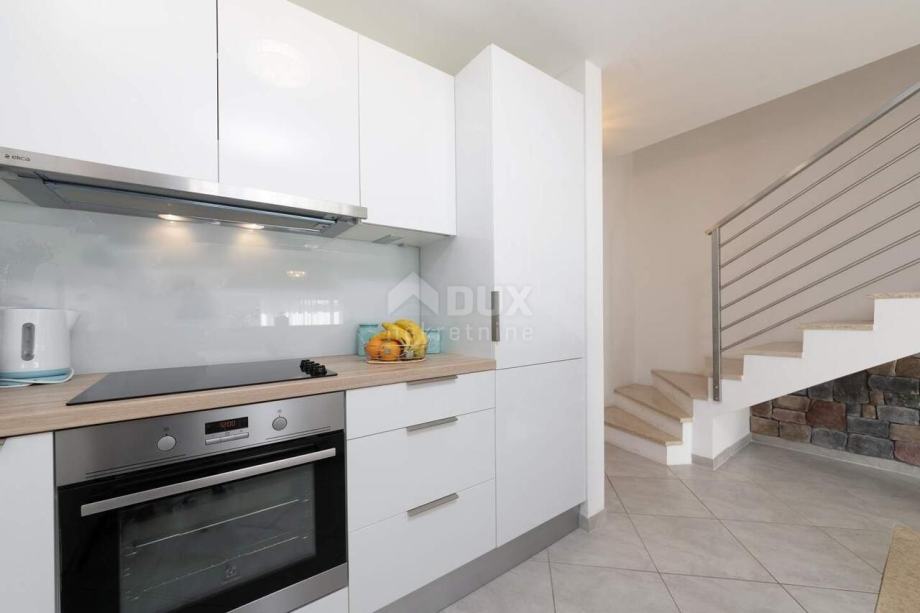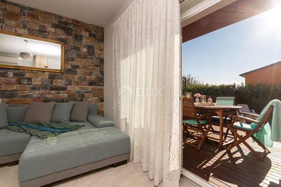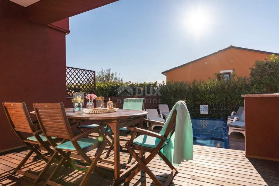 Kuća u nizu nalazi se na atraktivnoj poziciji u mirnom i tihom naselju. Lokacija je povoljna u svakom smislu: prometno je povezana s Umagom (6 km – do centra Umaga), s magistralnom cestom Umag – Koper (5 km – do graničnog prelaza Plovanija - SLO ). Jedna od najljepših plaža umaške rivijere, Kanegra nalazi se svega 2 km od objekta, a golf igralište i elitni Kempinski resort su samo 6 km od objekta. S a terasa se pruža prekrasan pogled na raskošno zelenilo istarskih šuma i bujnu vegetaciju koja osigurava toliko potreban čisti zrak. U prizemlju se nalaze dnevni boravak, kuhinja, sanitarni čvor i veća terasa kao produžetak "otvorenog dnevnog boravka" sa staklenom stijenom. Terasa je jednim dijelom natkrivena - nalazi se ispod gornje etaže. Na katu se nalaze dvije spavaće sobe, od kojih jedna ima terasu s dvorišne strane, veća kupaonica sa sanitarijama. Etaže su povezane unutarnjim stubištem. Čitav objekt je opremljen s prvoklasnim materijalom: sagrađen od poroterm blok opeke s demit fasadom, sa ugrađenim prvorazrednim pločicama i talijanskim sanitarijama i visoko kvalitetnom PVC šestokomornom, vanjskom stolarijom s ugrađenim aluminijskim roletama. Kuća je opremljena s klima uređajima marke Daikin, inverter, satelitskom TV antenom, telefonskom linijom i dr. U vrtu se nalaze bazen i jacuzzi. Kuća je kompletno namještena.