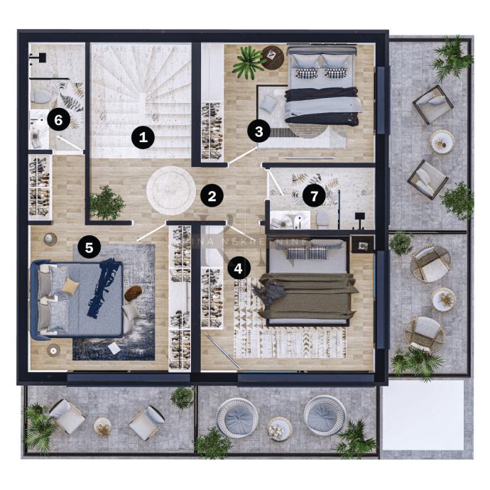 Druga etaža je osmišljena kao zasebni spavaći dio od tri spavaće sobe od kojih je jedna master bedroom sa vlastitom kupaonicom i izlazom na terasu, dok druge dvije izlaze na svoje zasebne terase i jednu zajedničku kupaonicu.