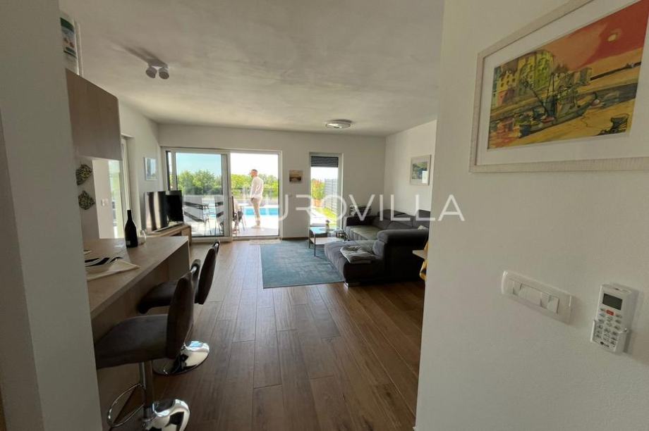 In the vicinity of Umag, in one of the nearby towns, there is this modern semi-detached house, NKP 169 m2, on a landscaped garden of 360 m2 with a 25 m2 swimming pool. The ground floor is dominated by a large and bright living room with a large glass wall and access to a covered terrace, landscaped...