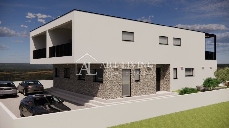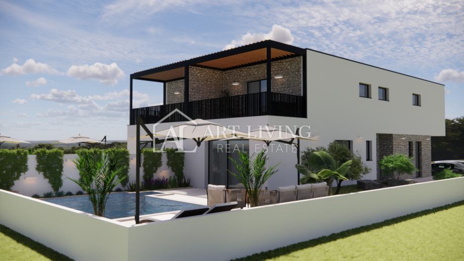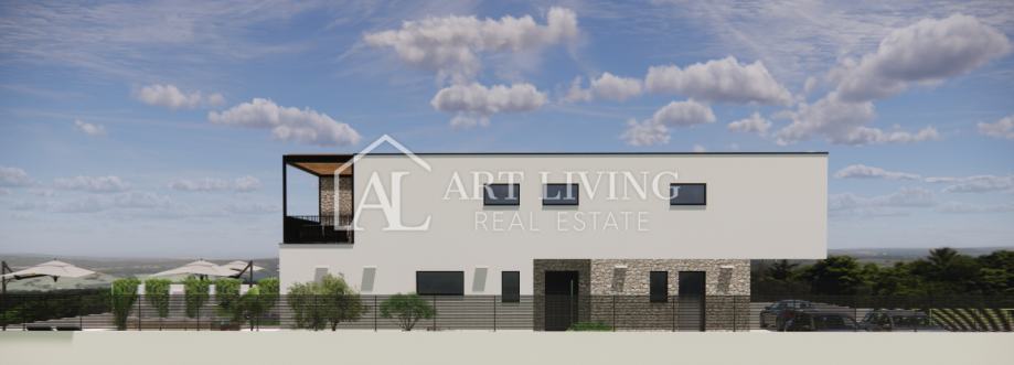 Kuća je modernog dizajna s detaljima od kamena, a gradi se od kvalitetnim materijala te će posjedovati energetski certifikat A+.