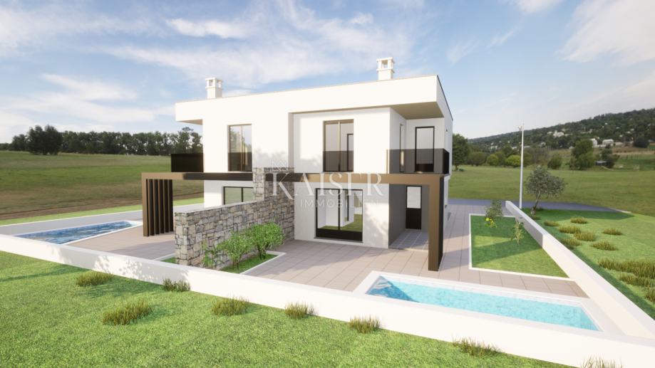 Ovaj moderan i funkcionalan dvoetažni stan sa bazenom u dvojnoj kući nalazi se u prizemlju i na prvom katu, a sastoji se prostranog dnevnog boravka sa kuhinjom, te kupaonicom u prizemlju te tri spavaće sobe i dodatne kupaonice na prvom katu. Na prvom katu nalazi se i terasa sa prekrasnim pogledom na okolicu naselja, dok u prizemlju ovaj prekrasan stan nudi manju natkrivenu terasa, te veliku terasu pod pergolom veličine 12m2. U sklopu kuće nalazi se iznimno praktično vanjsko spremište od 5,64 m2 za smještaj bicikli, rekvizita za plažu itd. Neto korisna površina stambene jedinice iznosi 121,24 m2, a stan ima i svoj bazen površine 15 m2 i pripremu instalacija za ljetnu kuhinju.
