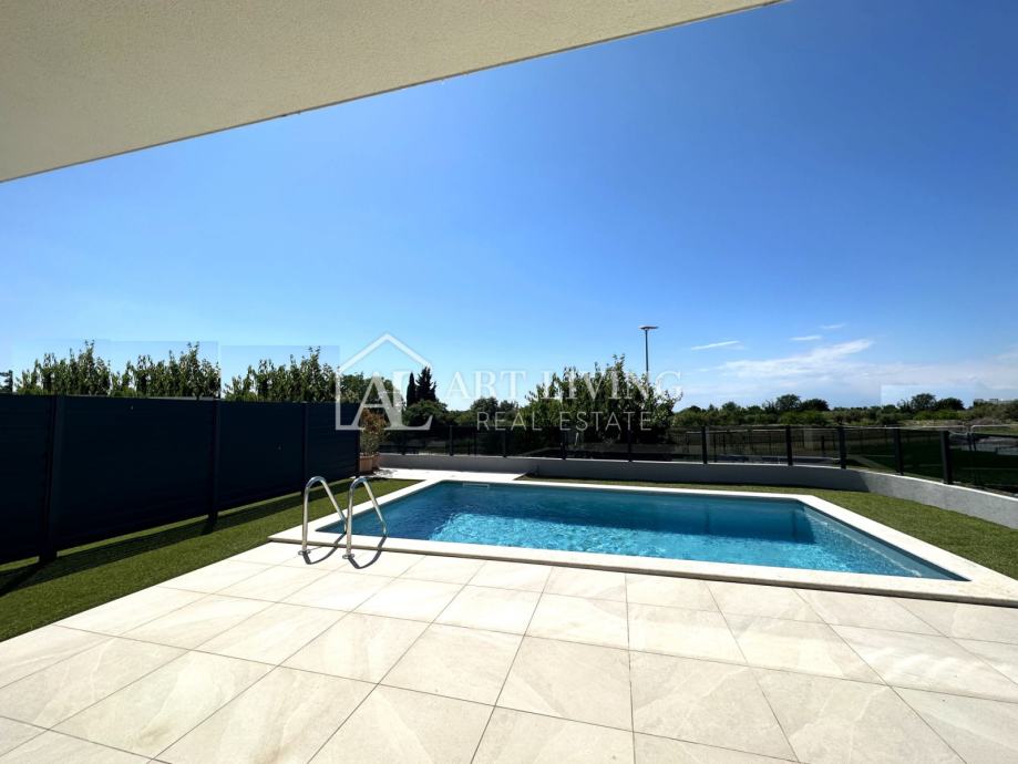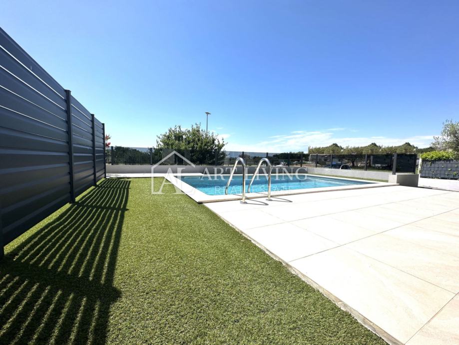 Prizemlje se sastoji od ulaza, predsoblja, jedne spavaće sobe, kupaonice s WC -om, dnevnog boravaka s kuhinjom i blagovaonicom otvorenog tipa s izlazom na natkrivenu terasu, vrt i bazen površine 25 m2.