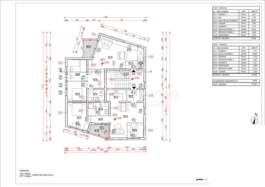 Stan na 1. katu, ukupne površine 67,66 m2 sastoji se od hodnika, open-space dnevnog boravka sa kuhinjom i blagovaonicom, 2 spavaće sobe, i kupaonice.