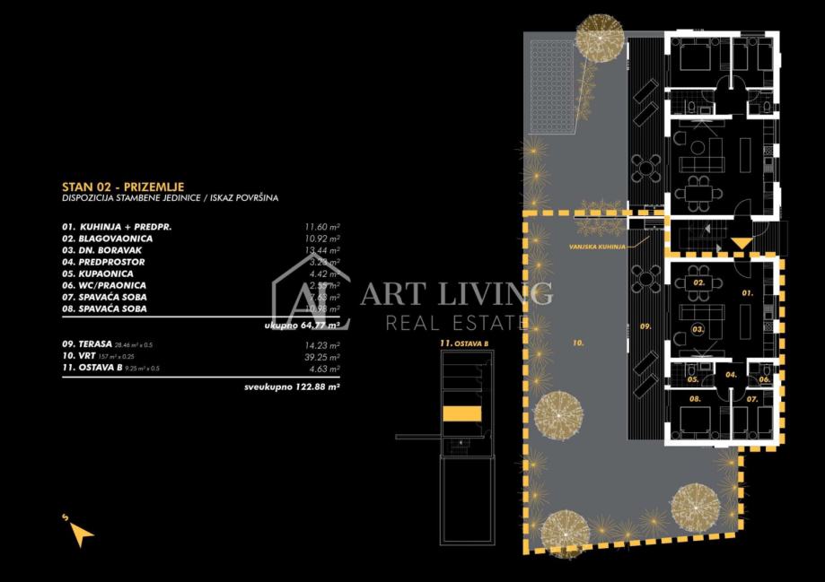 Ukupna neto korisna površina stana iznosi 122.88 m2. Sastoji se od dnevnog boravka sa kuhinjom i blagovaonicom otvorenog tipa, 2 spavaće sobe, kupaonice, wc-a za goste i hodnika. Iz dnevnog boravka se izlazi na veliku terasu površine 28 m2 sa koje se pristupa uređenoj okućnici površine 157 m2. Stanu pripada i ostava u podrumu zgrade te 1 parkirno mjesto, uz mogućnost nadoplate dodatnog parkirnog mjesta.