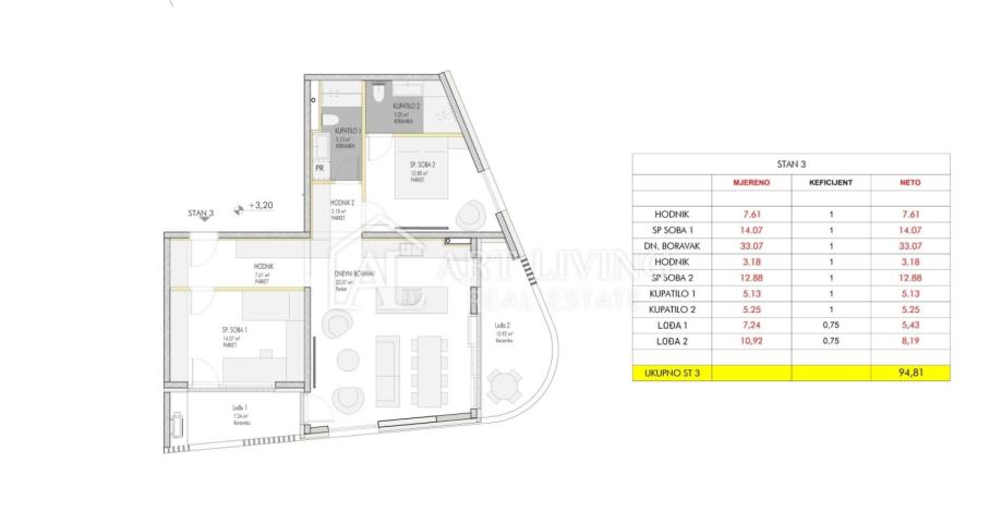 Stan ukupne neto korisne površine 94,81 m2 sastoji se od ulaznog hodnika, dnevnog boravka s kuhinjom i blagovaonicom otvorenog tipa, dvije spavaće sobe, kupatila i wc-a te čak dvije veliku loggie sa kojih su pruža prekrasan pogled na istarski krajolik.