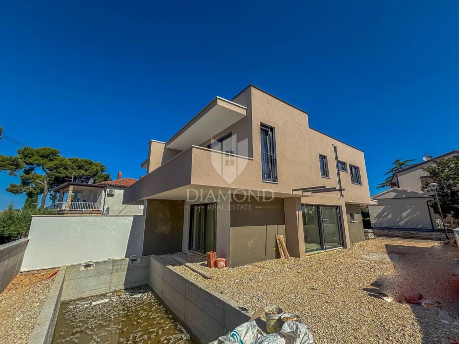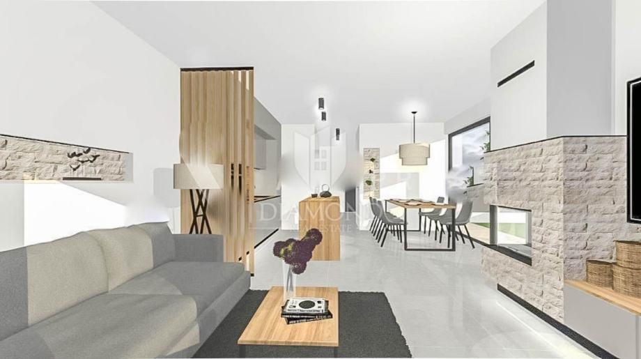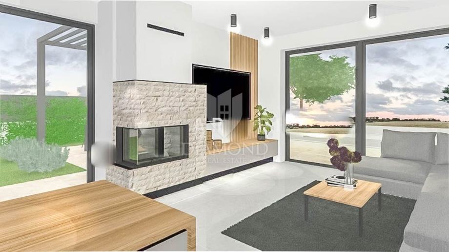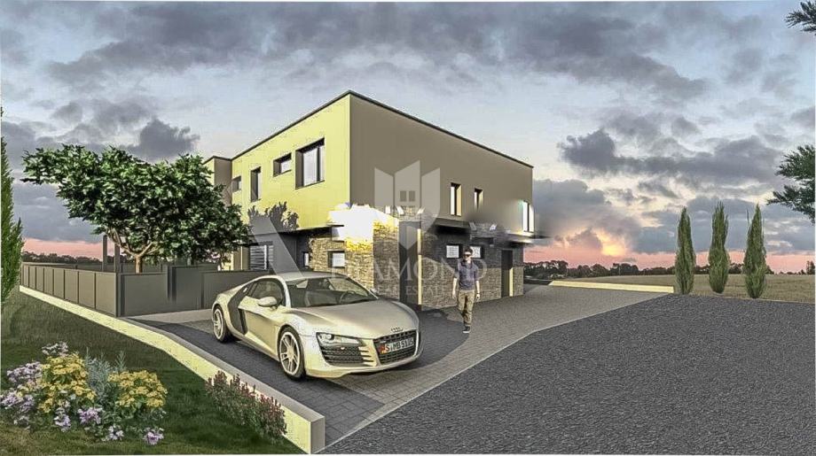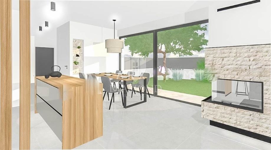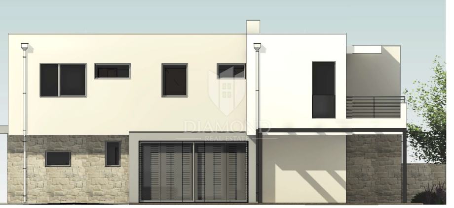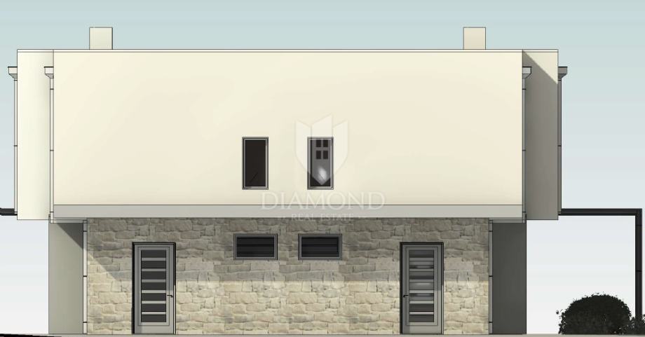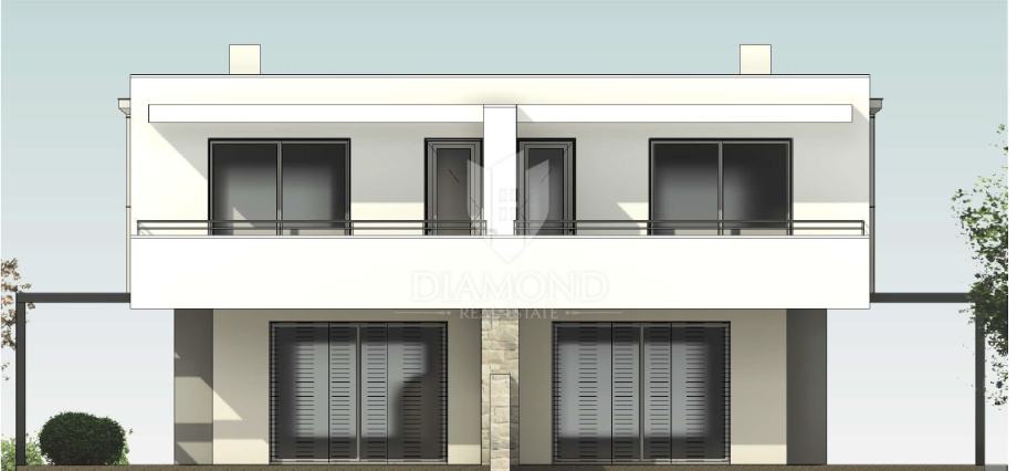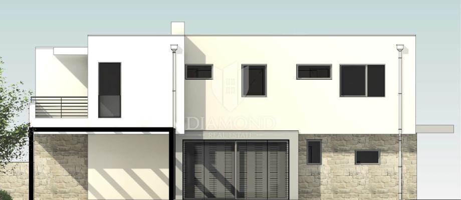 Na zemljiištu od preko 500m2 gradi se ova moderna dvojna kuća s bazenom. Kuća se prostire preko 110m2 stambenog prostora uz okućnicu od oko 180m2 na kojem je smješten bazen za sunčalištem. Ispred kuće je predviđena nadstrešnica za jedan automobil uz pripremu za električnu punionicu. Prizemlje kuće se sastoji od ulaznog hodnika, wc-a, kuhinje i prostranog dnevnog boravka sa izazom na naktrivenu terasu i bazen. U dnevnom boravku dominira centralni kamin koji će se pobrinuti za topao zimski ugođaj na moru. Unutarnjim stepeništem se dolazi na kat gdje su smještene 3 spavaće sobe i 2 kupaonice. Glavna spavaća soba ima svoje vlastito kupatilo i izlaz na prostran balkon s kojeg se pruža djelomičan pogled na more. Započeta je gradnja te se njen završetak planira do prosinca 2025.godine. Kuća se gradi vrhunskim materijalima te je kroz cijelu kuću sprovedeno podno grijanje na toplinsku pumpu.