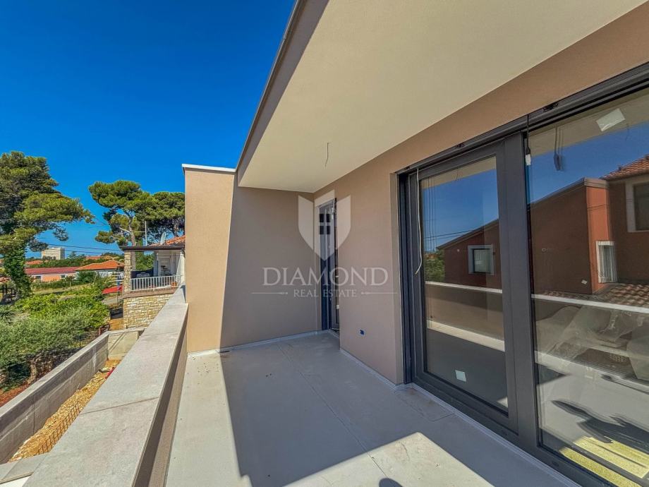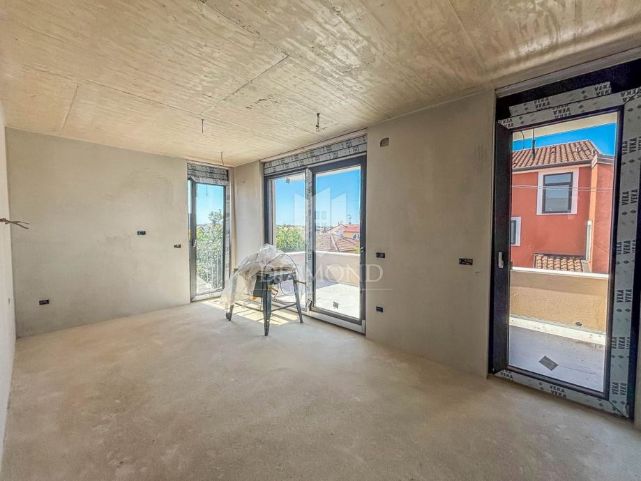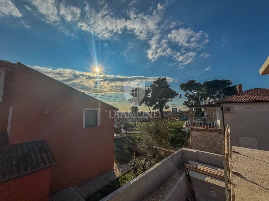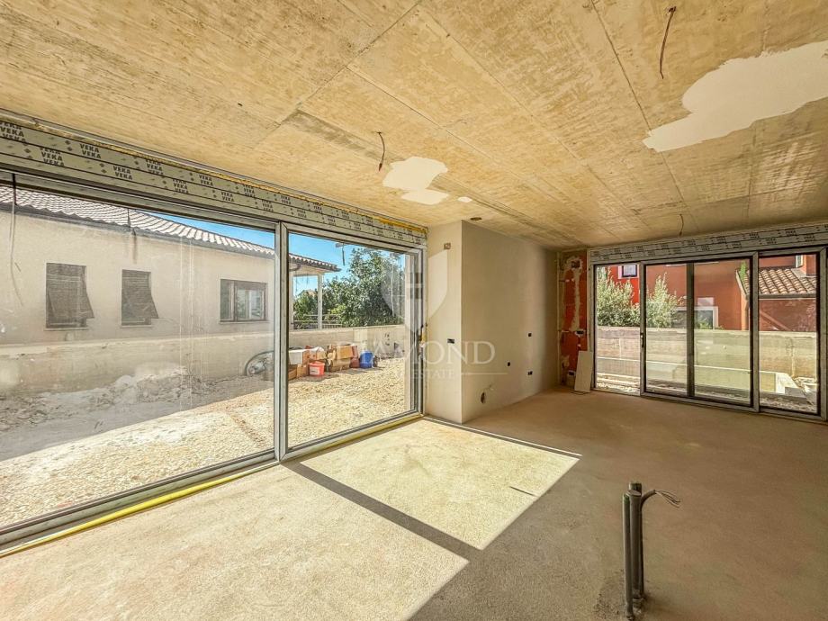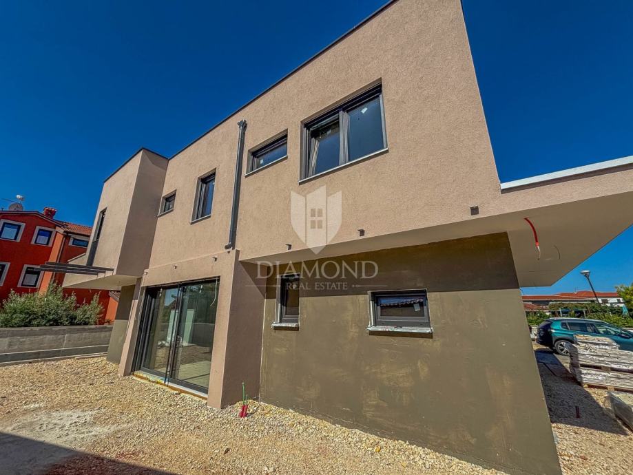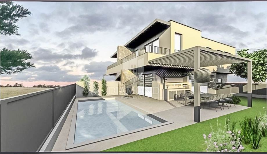 Na zemljiištu od preko 500m2 gradi se ova moderna dvojna kuća s bazenom. Kuća se prostire preko 110m2 stambenog prostora uz okućnicu od oko 180m2 na kojem je smješten bazen za sunčalištem. Ispred kuće je predviđena nadstrešnica za jedan automobil uz pripremu za električnu punionicu. Prizemlje kuće se sastoji od ulaznog hodnika, wc-a, kuhinje i prostranog dnevnog boravka sa izazom na naktrivenu terasu i bazen. U dnevnom boravku dominira centralni kamin koji će se pobrinuti za topao zimski ugođaj na moru. Unutarnjim stepeništem se dolazi na kat gdje su smještene 3 spavaće sobe i 2 kupaonice. Glavna spavaća soba ima svoje vlastito kupatilo i izlaz na prostran balkon s kojeg se pruža djelomičan pogled na more. Započeta je gradnja te se njen završetak planira do prosinca 2025.godine. Kuća se gradi vrhunskim materijalima te je kroz cijelu kuću sprovedeno podno grijanje na toplinsku pumpu.