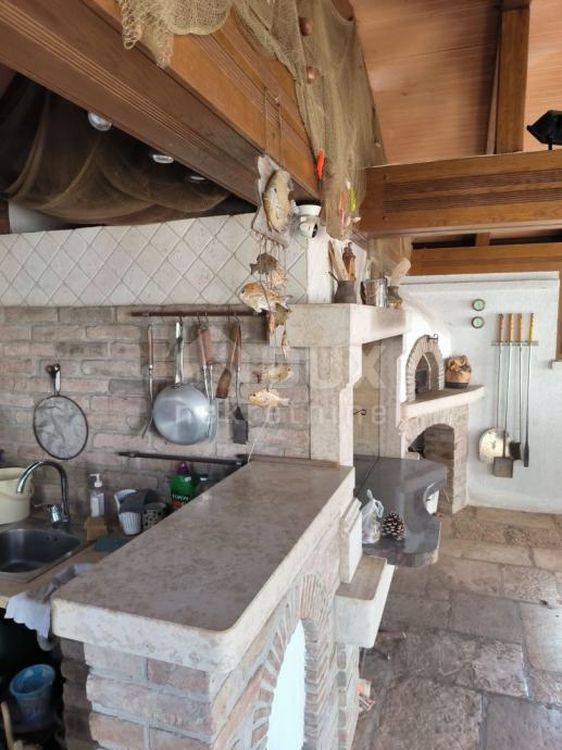 Okućnica je pomno uređena i vrlo njegovana i otvara mogućnost izgradnje bazena te osim prekrasnog vrta nudi i natkriveni prostor sa zidanim kaminom uz ribnjak za maksimalni hedonizam s obitelji i prijateljima.