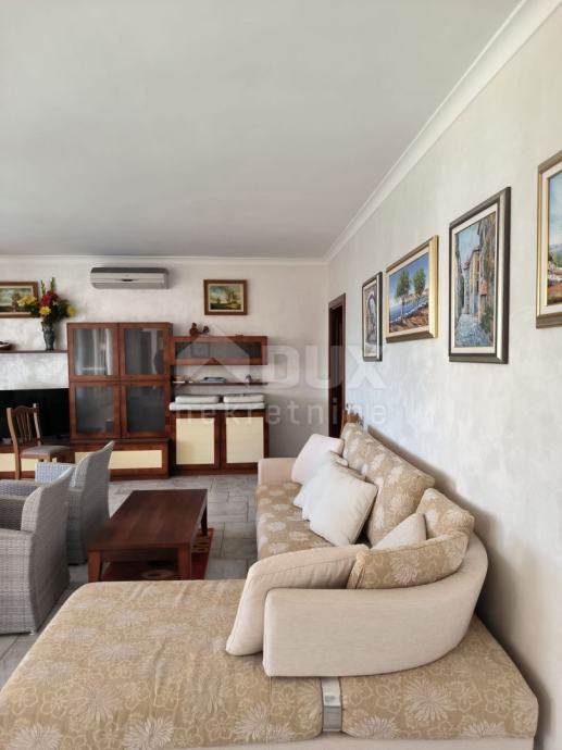 Već s prizemlja pruža se panoramski pogled na more i na grad te se u prizemlju smjestio prostrani i kvalitetno opremljen stan s open space dnevnim boravkom, kuhinjom, blagovaonicom, hodnikom, dvije spavaće sobe od kojih jedna ima vlastitu kupaonicu.