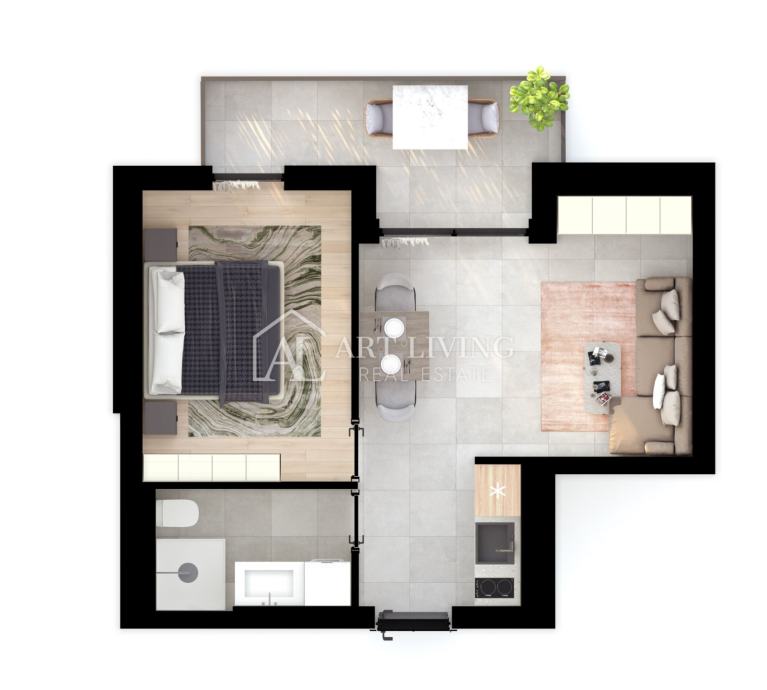 Stan je smješten na prvom katu moderne novogradnje sa liftom. Ukupna površina stana iznosi 37.40 m2. Sastoji se od dnevnog boravka sa kuhinjom i blagovaonom po open space konceptu, spavaće sobe i kupaonice. Iz dnevnog boravka izlazi se na prostranu natkrivenu terasu površine 6.20 sa pripremljenim instalacijama za ljetnu kuhinju.
