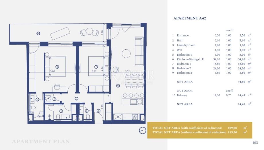 Predstavljamo apartman (A42) sa dvije spavaće sobom površine 114m2 koji se nalazi na trećem katu. Apartman se sastoji od dnevnog boravka i kuhinje, dvije spavaće sobe, dvije kupaonice, wc-a, praonice rublja i prostranog balkona. Apartman se nalazi u zgradi A nadomak svih sadržaja resorta, a posebice impresivnom vanjskom infinity bazenu koji su smješteni na krovu zgrade A. Apartman se prodaje opremljena suvremenim i stilskim namještajem.
