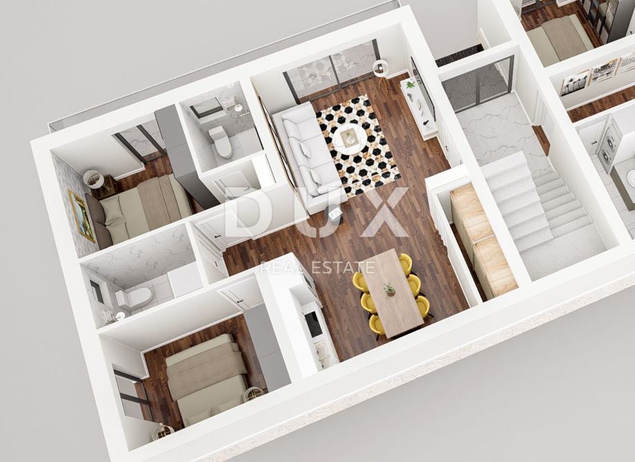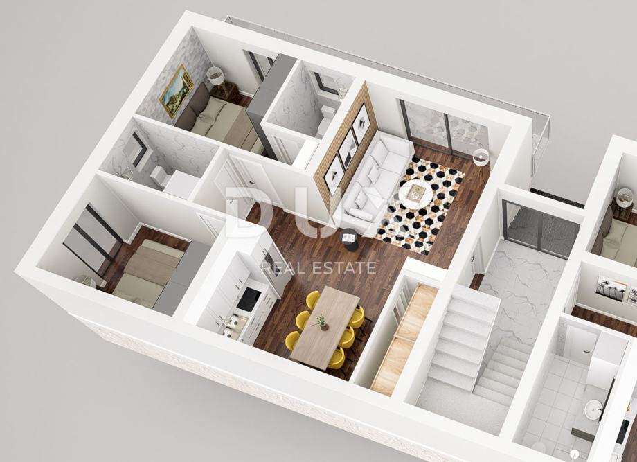 Ova nekretnina je savršena za obiteljski život ili kao investicija, budući da se nalazi u mirnom dijelu grada, a u neposrednoj blizini su svi bitni sadržaji: trgovine, škole, vrtići, restorani i ostalo potrebno za ugodan svakodnevni život. Stan je opremljen vrhunskim materijalima, podnim grijanjem, klima uređajem i pripadajućim parkirnim mjestom.