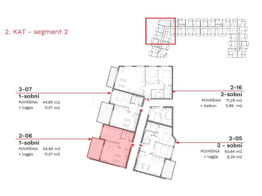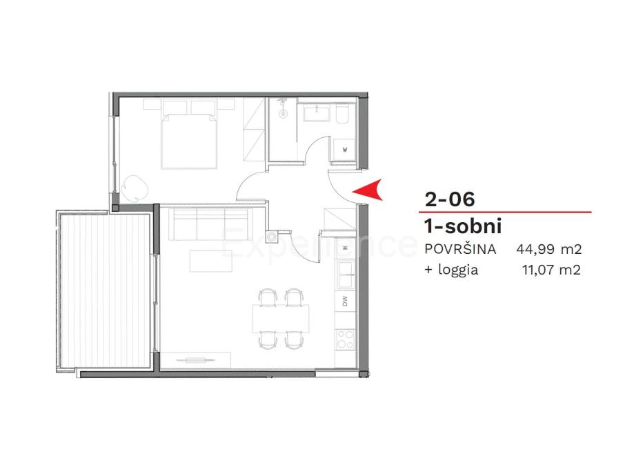 Na prodaji je dvosoban stan, površine 53,29 m². Stan se nalazi na drugom katu stambene zgrade. Sadrži: predsoblje, otvoreni i svijetao prostor u kojem su smješteni dnevni boravak, blagovaonica i kuhinja sa izlazom na prostranu lođu (11,07 m²), spavaću sobu i kupaonicu. Stanu također pripada spremište (3,44 m²), vanjsko natkriveno parkirno mjesto i garažno parkirno mjesto.