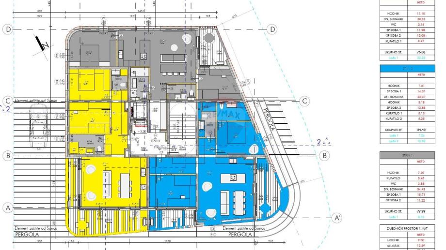 Na prvom katu prodaje se stan kvadrature 81,19 m2 plus 18,16 m2 terase . Sastoji se od dvije spavaće sobe , kupaone i wc-a te velike dnevne sobe s kuhinjom i blagavaonom.