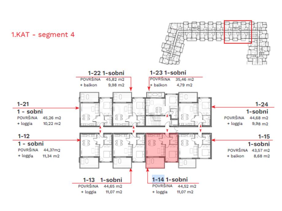 Na prodaji je dvosoban stan, površine 52,82 m². Stan se nalazi na prvom katu stambene zgrade. Sadrži: predsoblje, otvoreni i svijetao prostor u kojem su smješteni dnevni boravak, blagovaonica i kuhinja sa izlazom na lođu (11,07 m²), spavaću sobu i kupaonicu. Stanu također pripada spremište (2,67 m²) i parkirno mjesto.